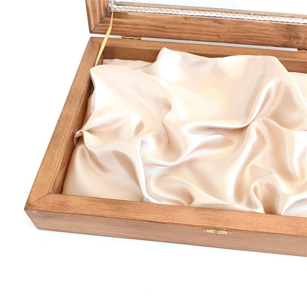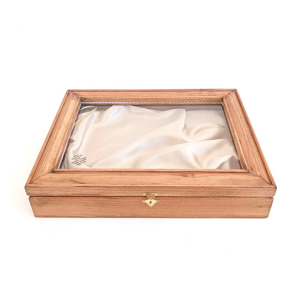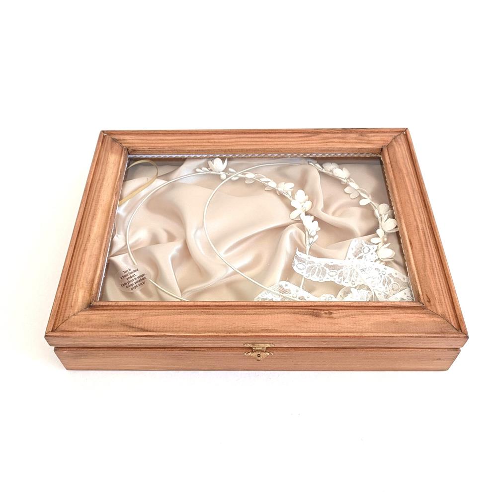 Ξύλινη στεφανοθήκη – προθήκη “Antique” στην απόχρωση Almond Wood (ξανθό καρυδί). Διαθέτει υφασμάτινο μαξιλαράκι σατέν ύφασμα σε ιβουάρ/σαμπανί χρώμα. Είναι κατασκευασμένες από μασίφ ξύλο ελάτης και πεύκου. Ελληνικής κατασκευής, με χειροποίητη τεχνητή παλαίωση και φινίρισμα από άχρωμο προστατευτικό βερνίκι. Η πρώτη ύλη επιτρέπει να εμφανίζονται τυχόν νερά ή ρόζοι. Το αντικείμενο ενδέχεται να φέρει ελάχιστες αποκλίσεις ανά προϊόν λόγω της χειροποίητης κατασκευής του.