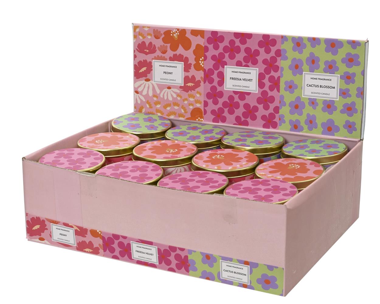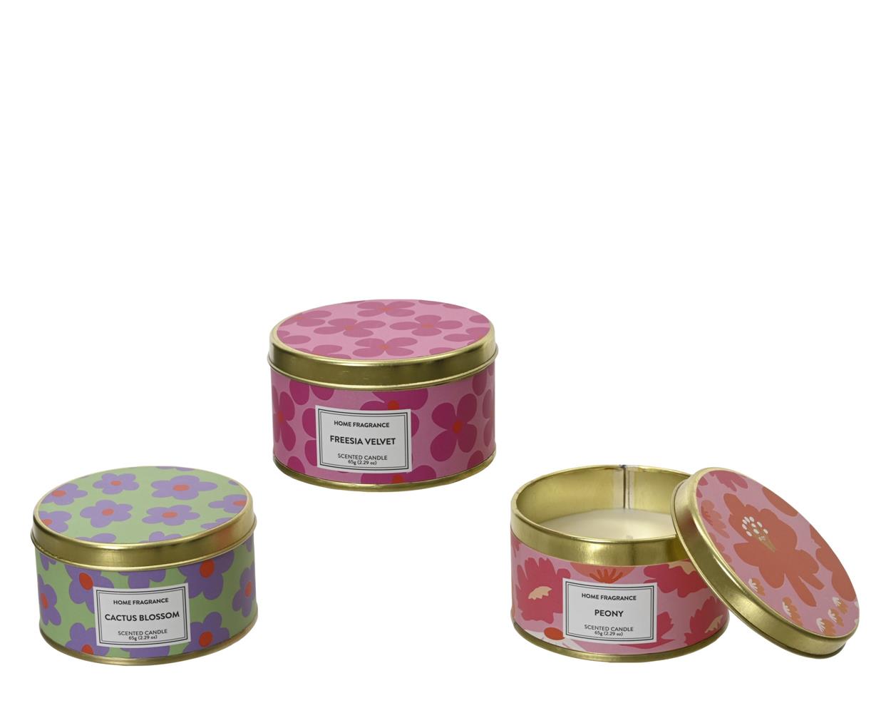 \"Αρωματικά κεριά, πολύχρωμα μεταλλικά κουτιά με λουλουδάτο μοτίβο, σε 3 χρώματα.