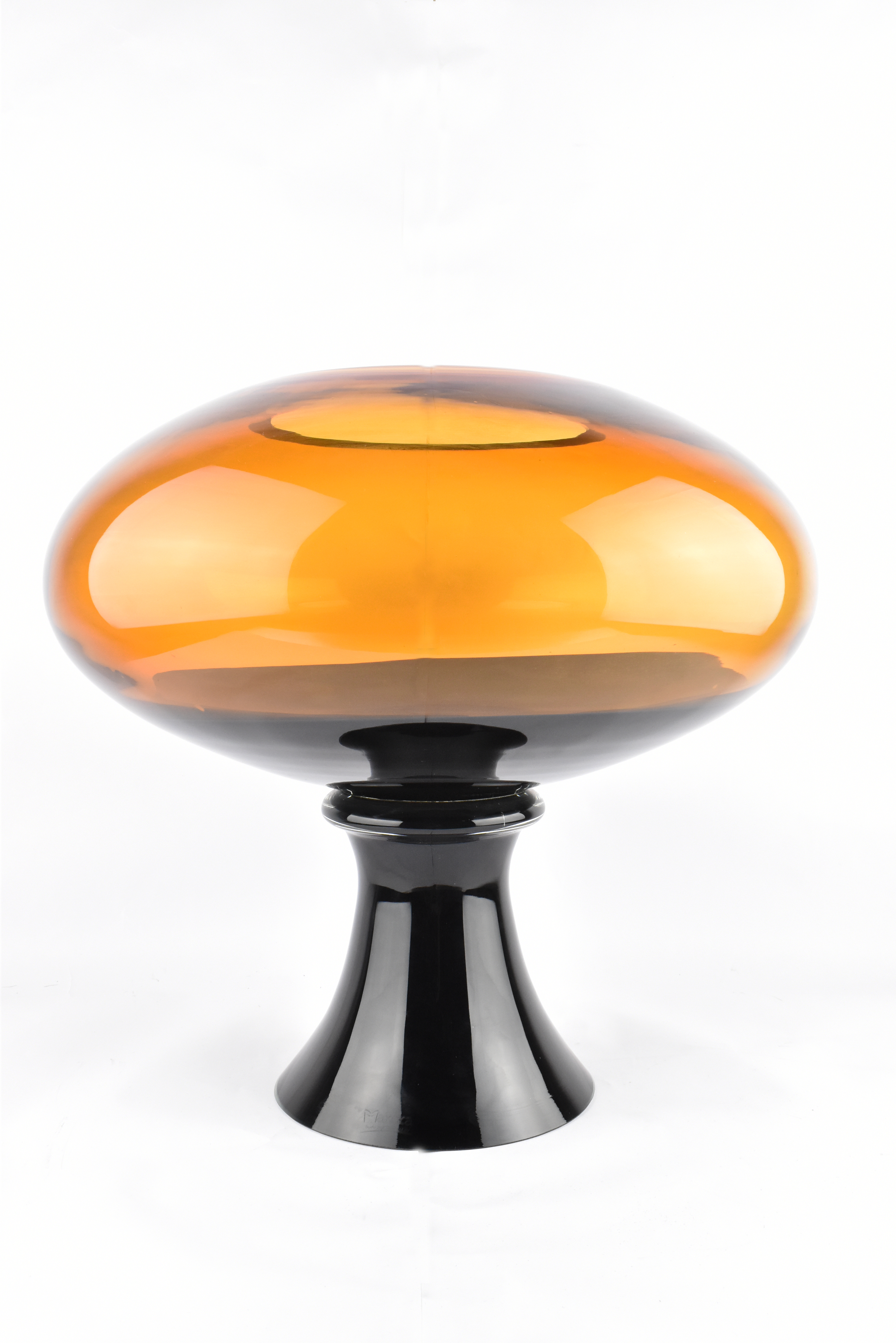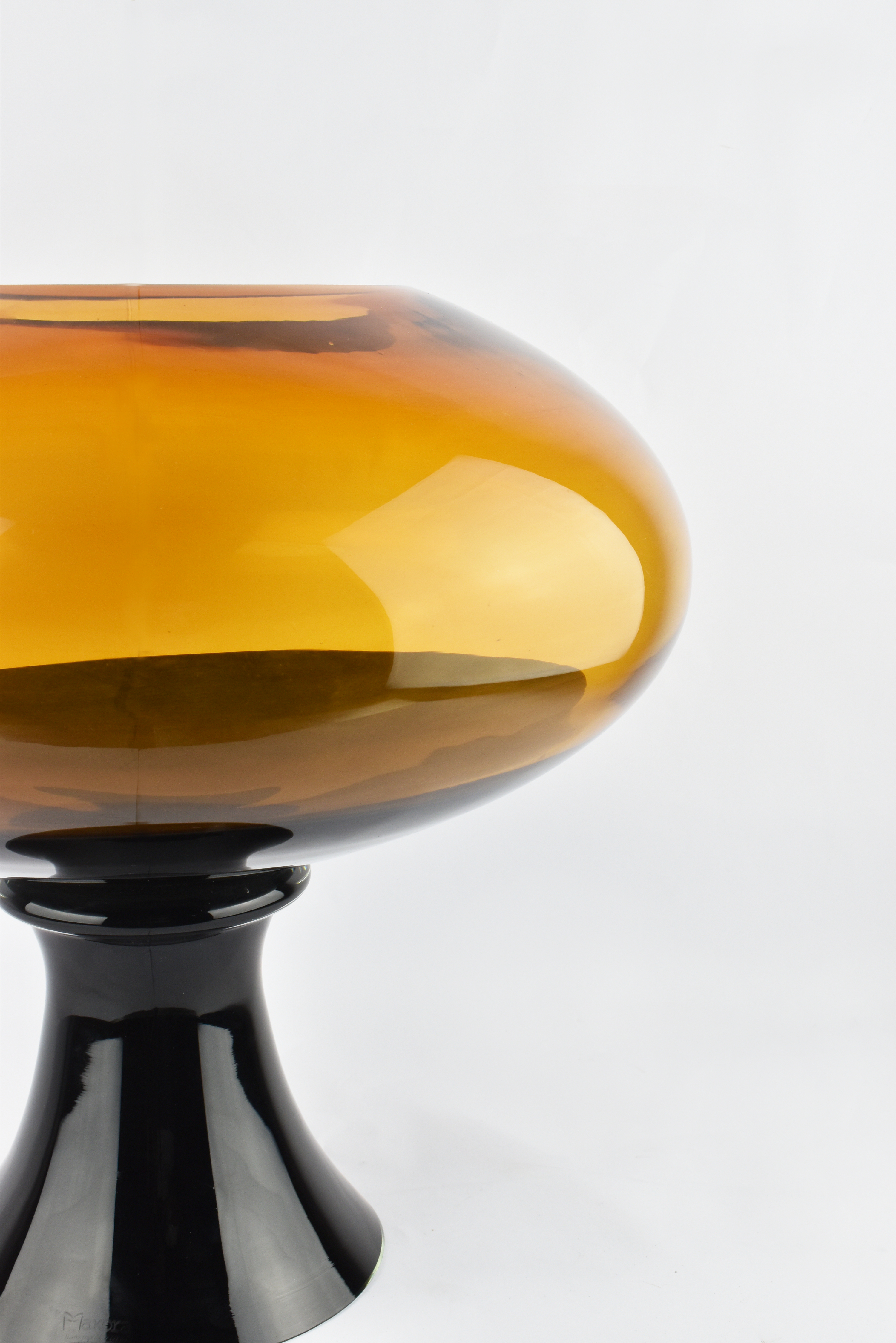 Γυάλινο βάζο στρογγυλό σε μελί χρώμα με μαύρο πόδι
