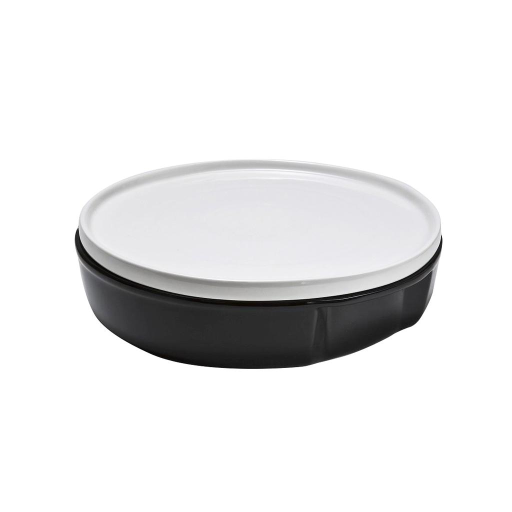 Πυρίμαχο σκεύος σερβιρίσματος ρηχό μαύρο με λευκό καπάκι στρογγυλό.