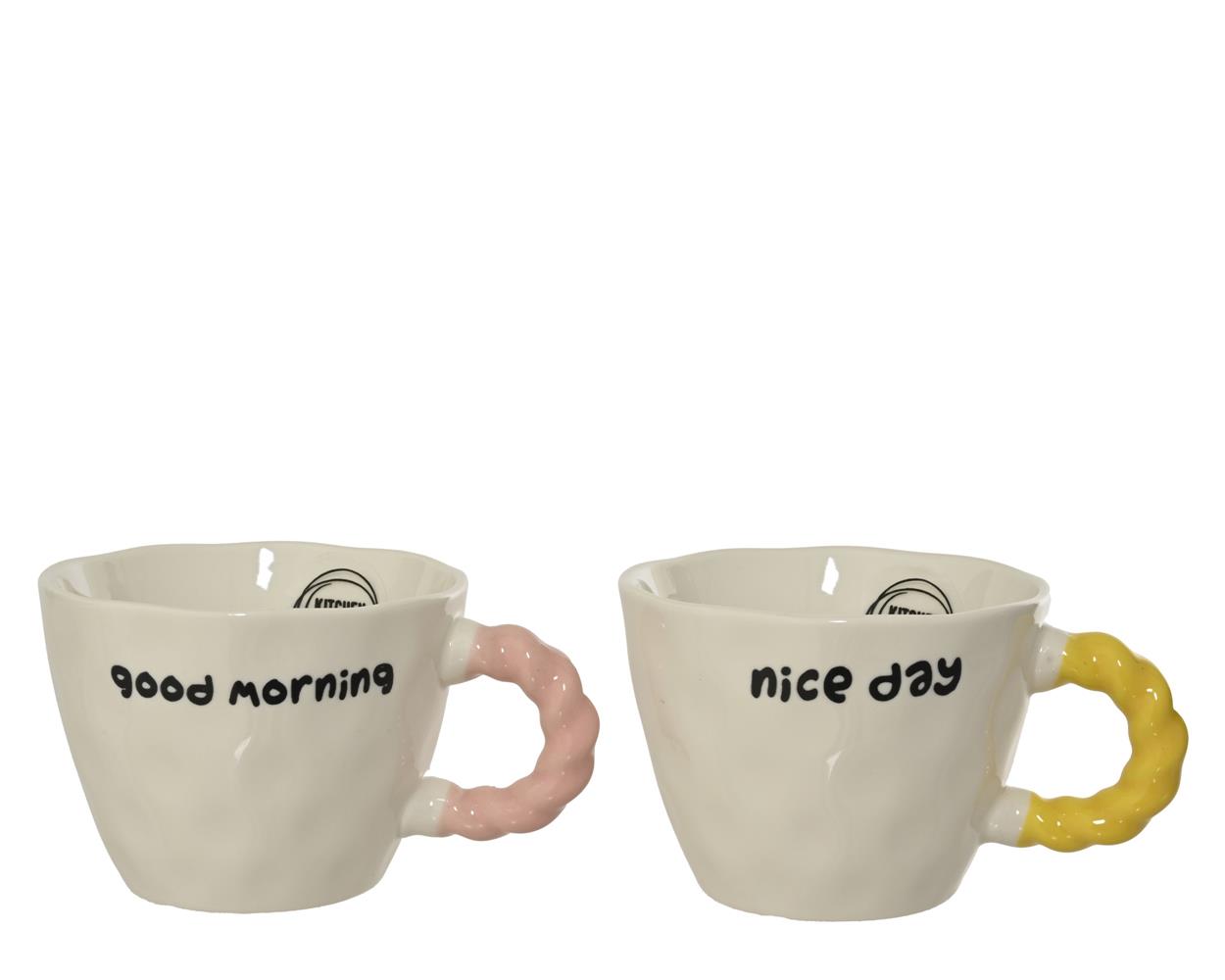 Ξεκινήστε το πρωί σας με μια πινελιά χαράς χάρη σε αυτές τις κομψές κούπες από την Kitchen Goods. Οι λευκές πορσελάνινες κούπες διαθέτουν ένα παιχνιδιάρικο κυματιστό μοτίβο, σε συνδυασμό με μια απαλή ροζ και μια έντονη κίτρινη λαβή που τους δίνει μια χαρούμενη εμφάνιση. Με το στρογγυλεμένο σχήμα τους και το ύψος των 7,5 cm, αποπνέουν μια διαχρονική κομψότητα που ταιριάζει άψογα σε κάθε εσωτερικό χώρο. Η μεταξωτή εκτύπωση προσθέτει μια διακριτική διακοσμητική πινελιά σε αυτές τις πρακτικές κούπες.
