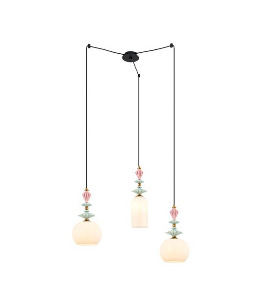 Bulb: 3xE27Power: MAX40WInput: 220-240V, 50/60HzDimensions: O:80cm H:140cmBase: O:12cm H:3cmOpal Glass: O:21cm H:16cm O:13cm H:24cmMaterial: Metal-Ceramic-Opal GlassSpecial Feature: 150cm Cable Adjustable