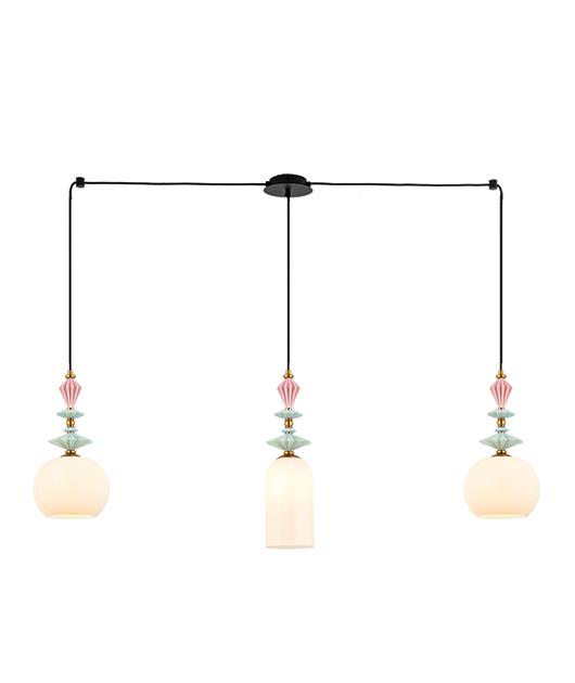 LINE PENDANT LIGHT SANDY BLACK WITH BRONZE ANTIQUE DETAILS, WHITE OPAL GLASS, CERAMIC LIGHT BLUE AND PINK DETAILS Metal 110x21xh140