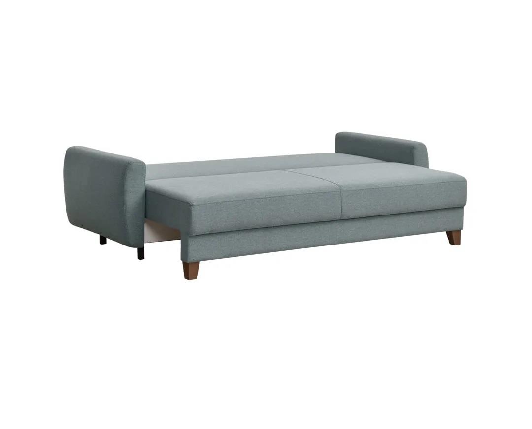 Three-seater sofa with storage space and bed. By pulling the seat forward we have the storage space under it and by dropping the back a double bed is created with dimensions of 200x145 cm. The core of the seat and bed consists of independent pocket springs, offering absolute sitting comfort, restful and orthopedic sleep. Frame reinforced with solid beech wood for greater durability. Modern design, high quality, useful and functional, also ideal for professional premises.