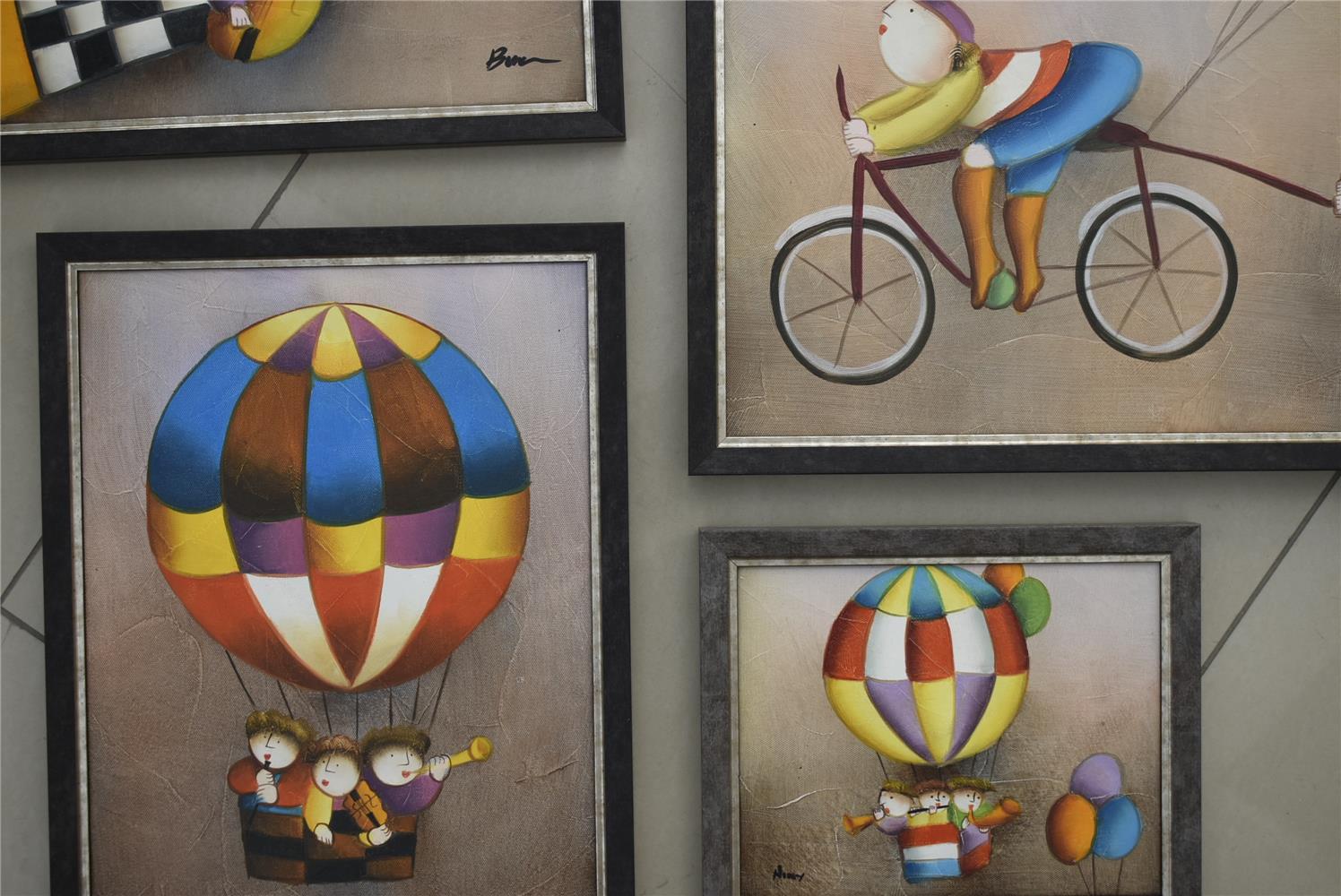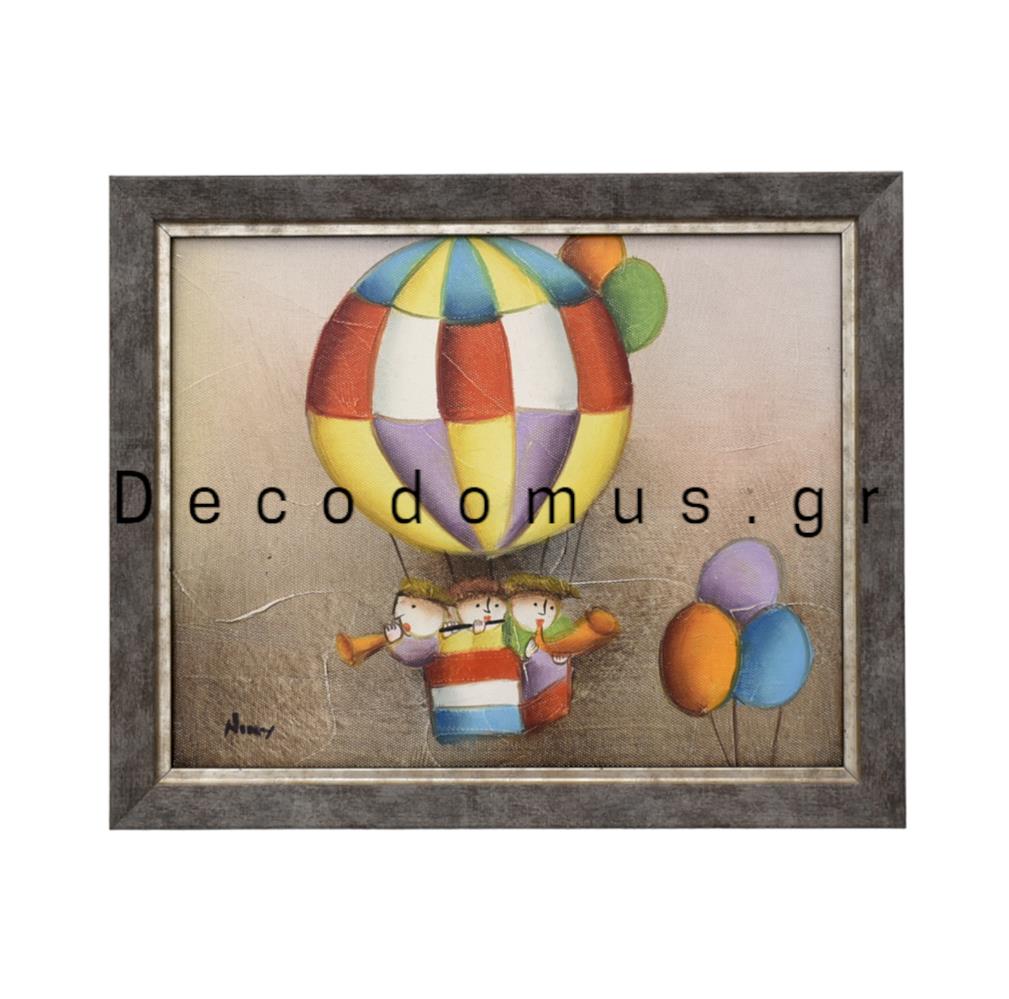 Handmade painting hot air ballon with three musicians and three balloons.