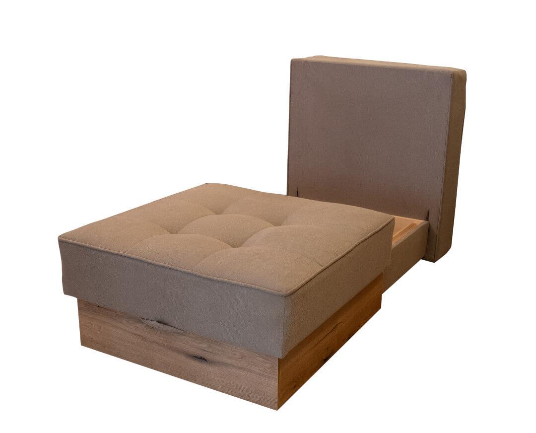 Armchair bed with storage. Its mattress is made of Bonnell springs and is suitable for everyday sleep. The frame is made of solid beech wood for greater durability. It is produced in two dimensions, armchair and two-seater as well as in Ho.Re.Ca cases and three-seater. The bed measures 90*190cm.