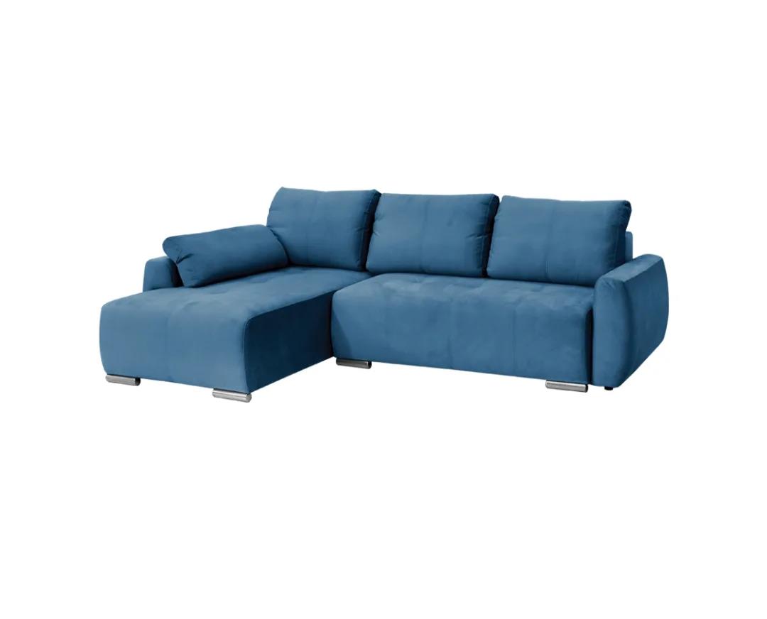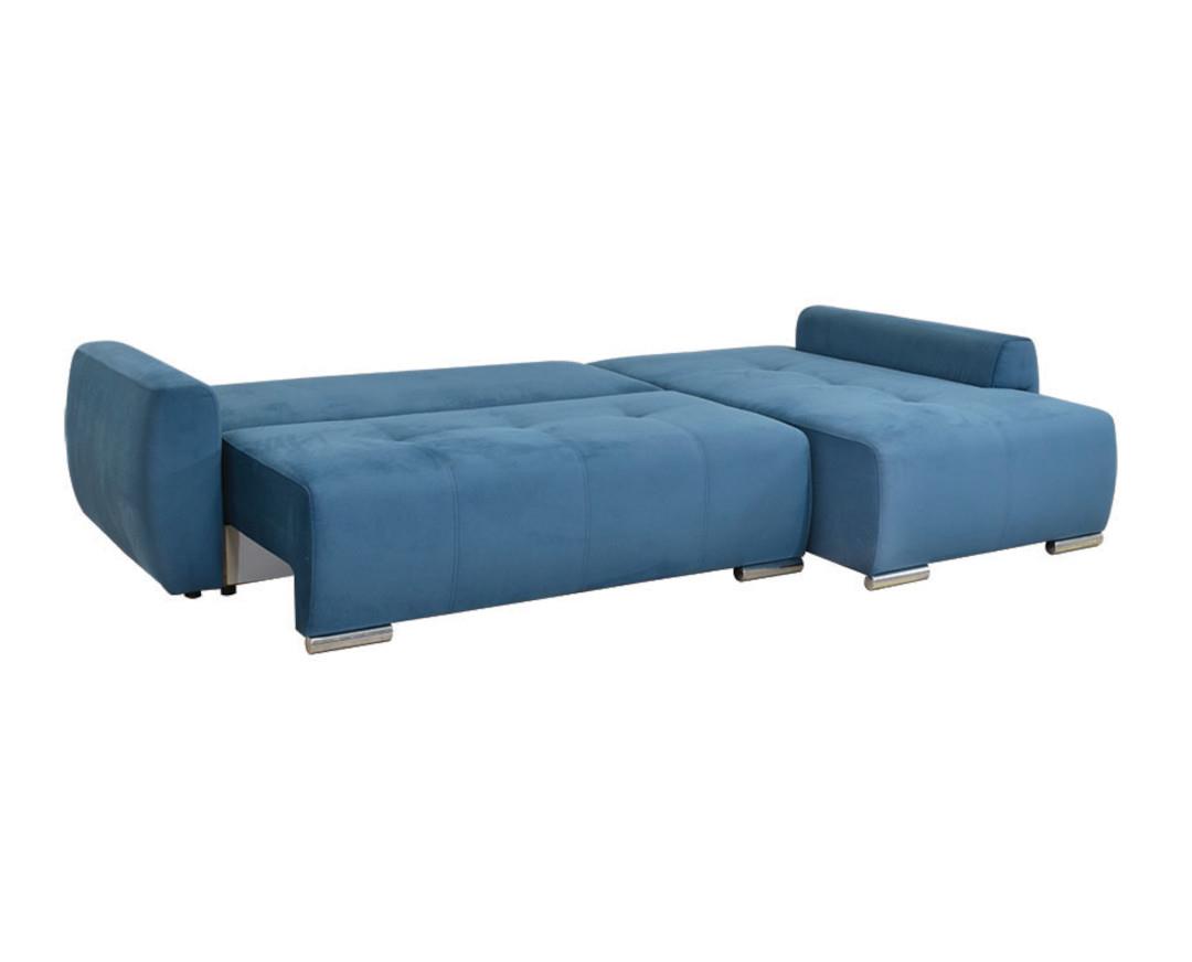 Corner sofa, with storage space and bed. Pulling the seat forward, we have the storage space below it, and dropping the back creates a double bed with dimensions of 200*145cm. Pioneering and innovative seat and bed core consists of independent pocket springs, offering absolute sitting comfort, restful and orthopedic sleep. Frame reinforced with solid beech wood for greater durability. Modern design, high quality, useful and functional, also ideal for professional premises due to the easy clean fabrics.