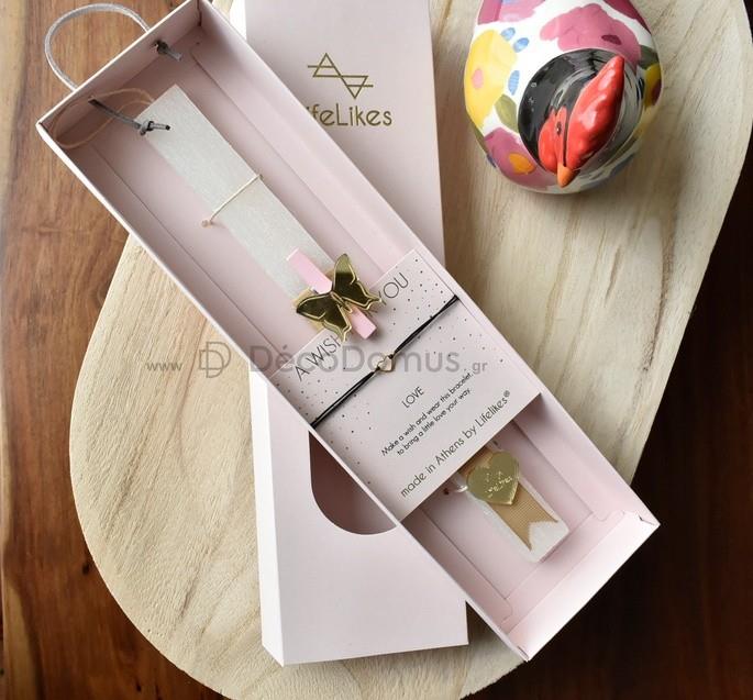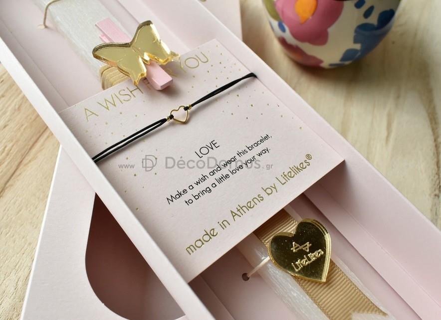 ish \"Happy Easter\" with the handmade beige candle, in a pink drawer box, with gold print. The candle is accompanied by a charm bracelet with a hanging heart, made of 18K gold-plated brass, and a greeting card:\'\'Make a wish and wear this bracelet to bring a little love your way.\'\'