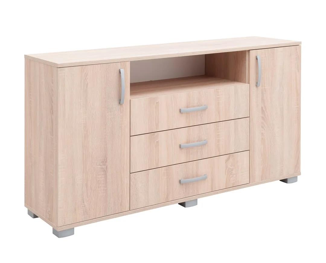 Also ideal for a TV stand. It has cupboards, 3-level shelves on the two doors on the right and left of the furniture, while in the middle there are 3 external deep drawers. It also has an open shelf in the middle of the furniture for DVD, CD, home cinema... It is made of high quality and dense chipboard (melamine) 18 mm thick from the European producers EGGER, KRONOSPAN. With certified and guaranteed mechanisms of the European houses INCOLL, HETTICH, TITUS. Metal handles - knobs from the European house RUJZDESIGN. ABS socorro finish, soft forming. High aesthetics, excellent quality, economical, functional