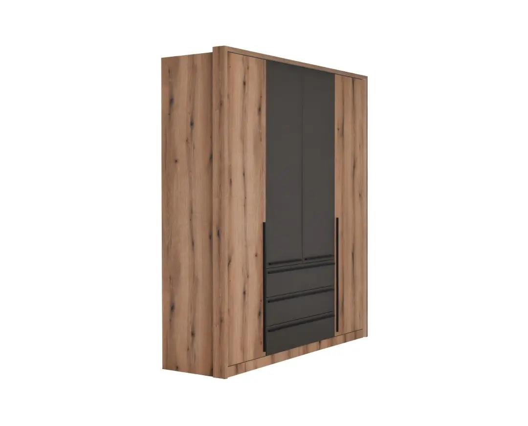 Kaliopa four-leaf wardrobe, three external drawers with telescopic movement mechanisms in the middle of the wardrobe, two three-level storage shelves above the drawers, right and left door with hanging space and storage loft, in a modern color combination, natural artisan with anthracite color.It is made of high-quality and dense chipboard (melamine) 18 mm thick, from the European producers EGGER, KRONOSPAN. Titus door hinges with brake (slow motion). With certified and guaranteed mechanisms of the European houses INCOLL, HETTICH, TITUS. Modern ABS acrylic handles - knobs from the European house RUJZDESIGN. ABS socorro finish. High aesthetics, excellent quality, economical, functional.