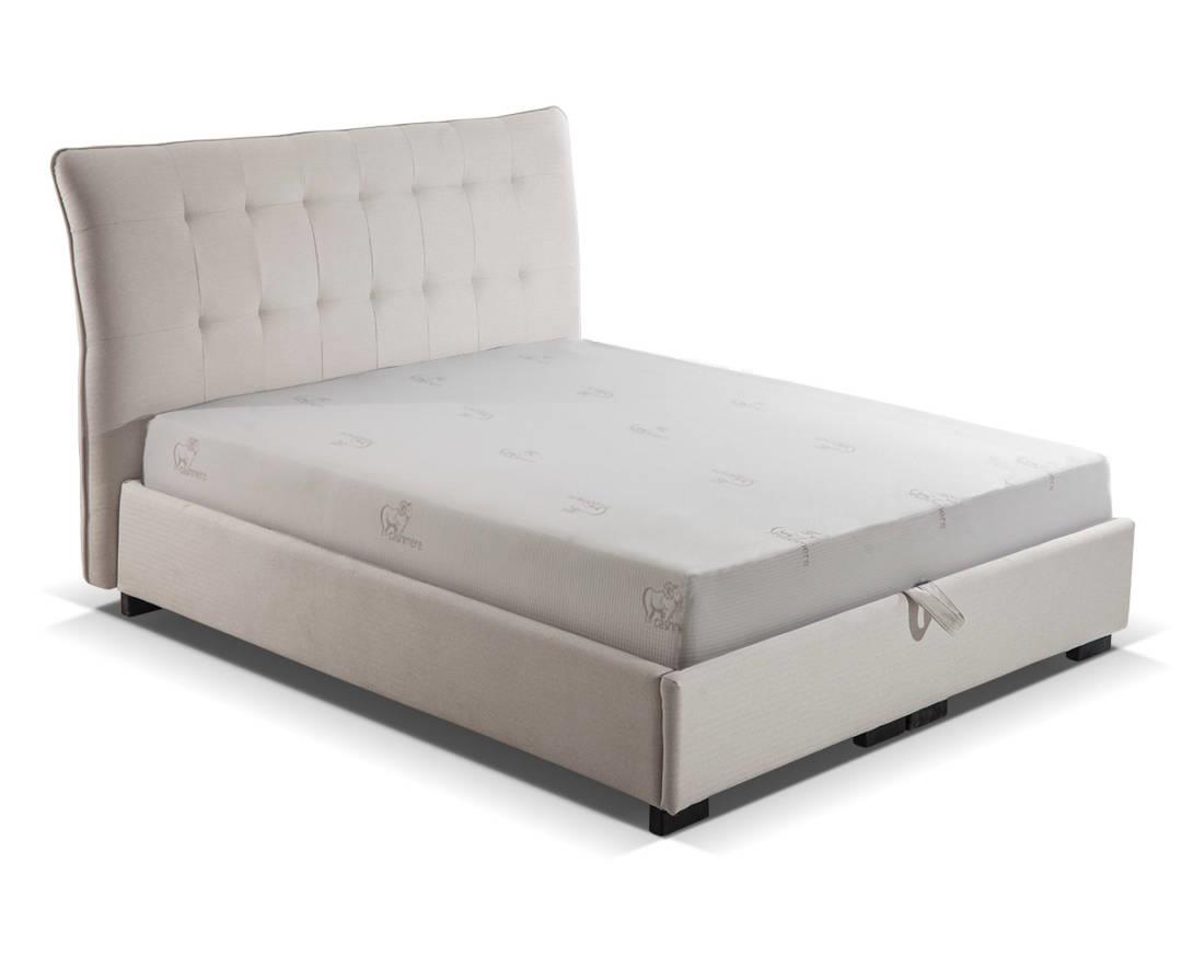 Modern bed, of high quality and aesthetics with storage space and mattress. The mattress integrated in the slatted frame is raised with a shock absorber with a simple movement to access the storage space, in which 2 air ducts are installed for continuous air circulation. The storage area consists of 2 boxes of 70*200cm for easier and safe transport. Solid beech wood legs. The height of the headboard is 125cm. Choose the color and texture of the fabric that suits you in your room and rest every day. The price includes the cost of fabric.