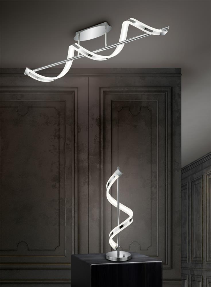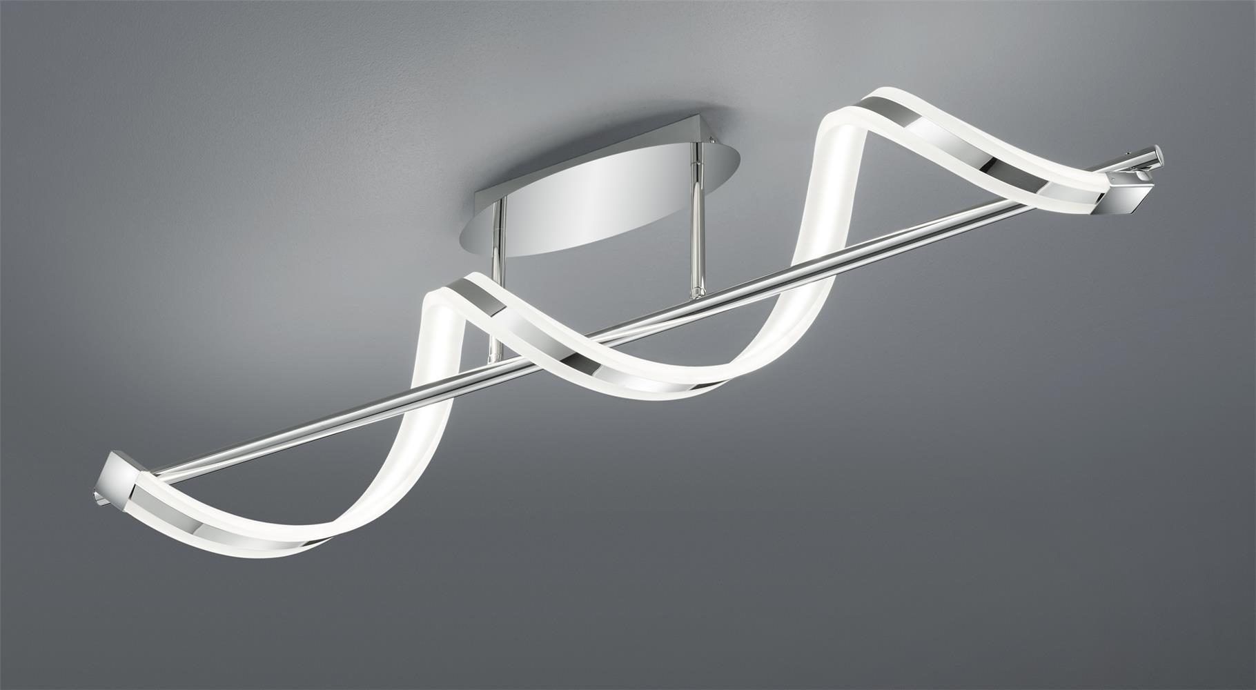 The SYDNEY LED ceiling light has a modern design: It appears as a strip of chrome-plated metal and acrylic that winds around a metal rod in the centre. The light from the warm white LEDs shines in all directions and not only provides bright room illumination, but also creates a cosy ambience. The chrome-plated look harmonises with numerous contemporary furnishing styles. The luminaire has a width of 103cm. The mix of chrome-coloured surface and acrylic creates exciting contrasts. In addition, the luminaire features modern LED technology, which is characterised by high light quality and energy efficiency. Compared to conventional halogen lamps, up to 80% of energy costs can be saved. In addition, LED light sources have a long service life, produce less heat and protect the environment.