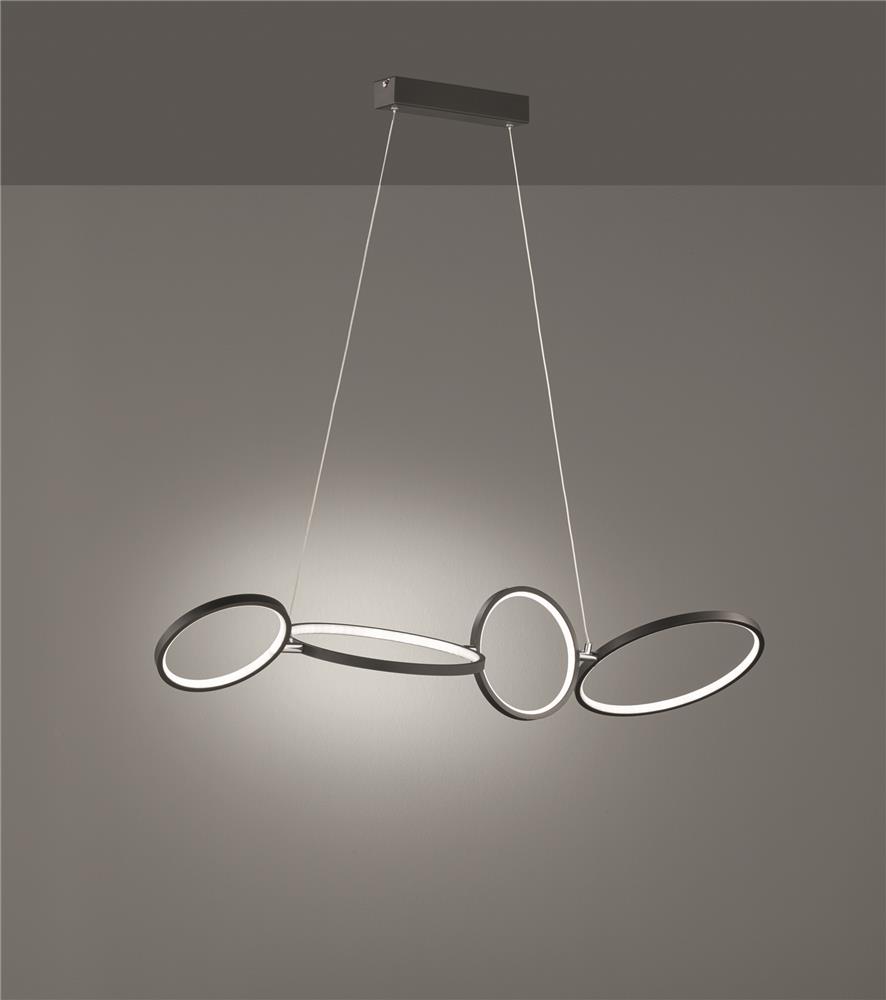 With its four rings of different diameters arranged side by side, the RONDO pendant light is a real eye-catcher. The pendant light has an integrated dimmer that is controlled via the light switch. This allows flexible control of the brightness of the LEDs installed on the inside of each circle. The 110 cm wide pendant light with a height of 150 cm is a true decorative element and stylishly enhances any living space. Thanks to the matt black colour scheme, the light can be combined with many furnishing styles. In addition, the luminaire features modern LED technology, which is characterised by high light quality and energy efficiency. Compared to conventional halogen lamps, up to 80% of energy costs can be saved. In addition, LED light sources have a long service life, produce less heat and protect the environment.