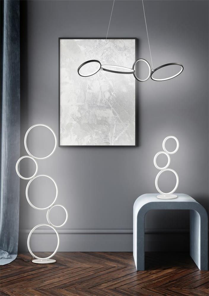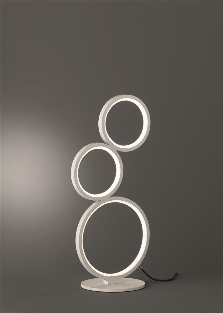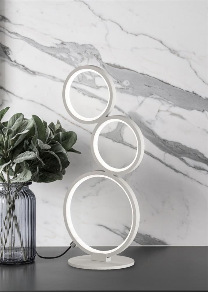 With its three stacked rings of different diameters, the RONDO table lamp is a real eye-catcher. The table lamp has an integrated dimmer that is controlled via the cord switch. This allows you to flexibly control the brightness of the LEDs installed on the inside of each circle. The 45 cm high table lamp is a real decorative element and stylishly enhances any living space. Thanks to the matt white colour scheme, the light can be combined with many furnishing styles. In addition, the luminaire features modern LED technology, which is characterised by high light quality and energy efficiency. Compared to conventional halogen lamps, up to 80% of energy costs can be saved. In addition, LED light sources have a long service life, produce less heat and protect the environment.