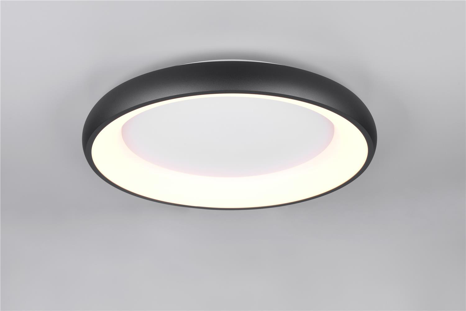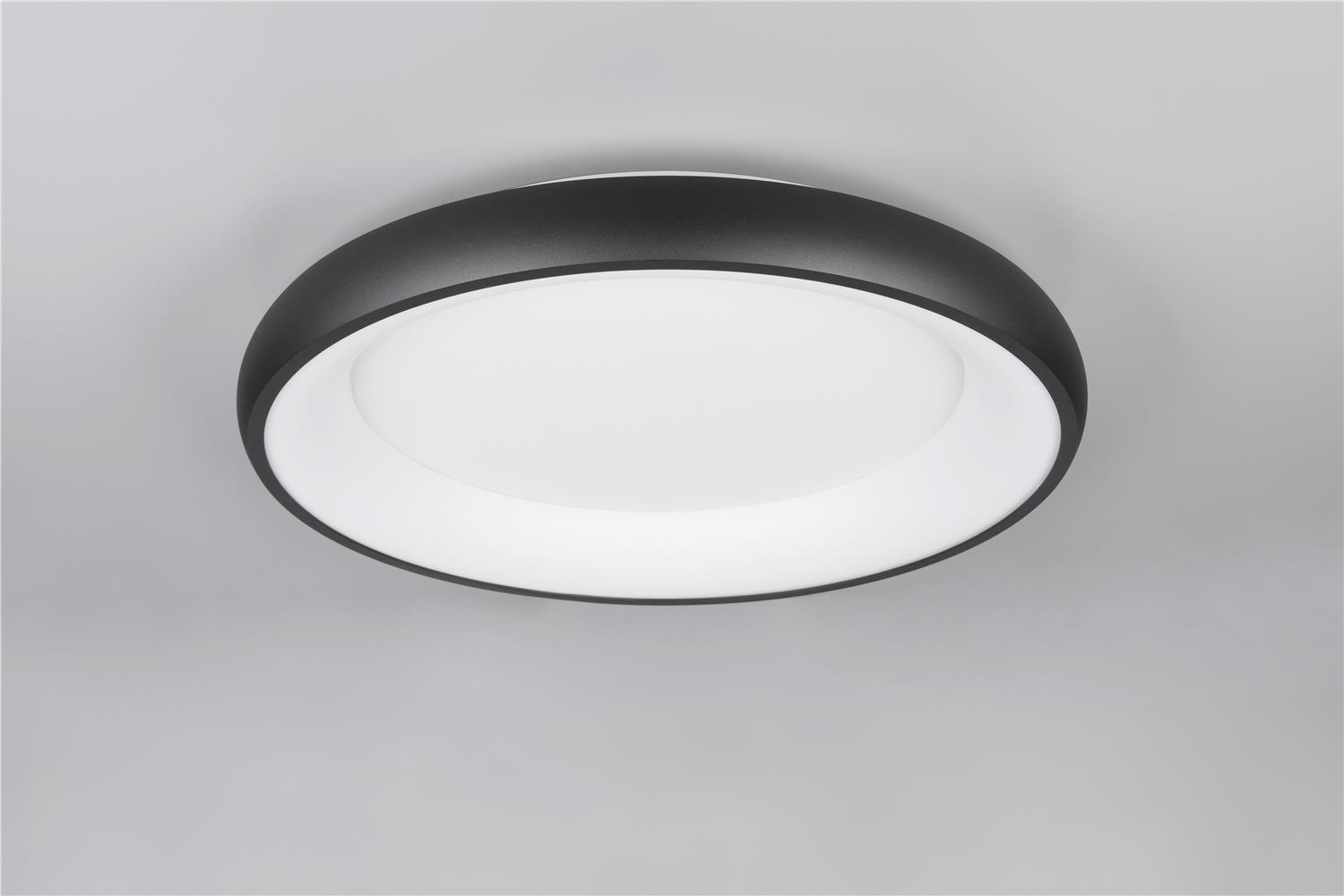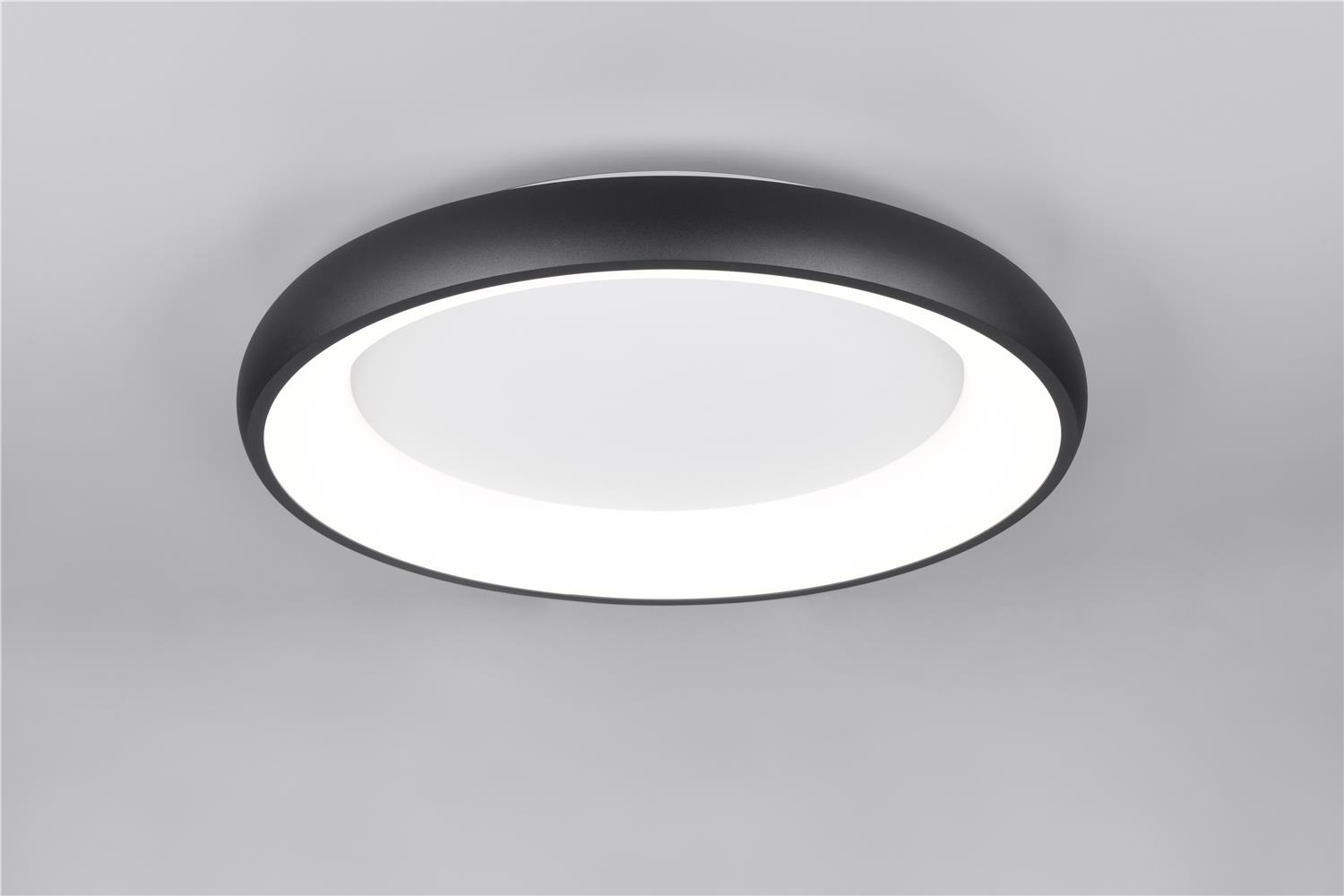 Clarity and functionality combined - the CARDONA ceiling light impresses with its striking design, which is characterised by a ring. This elegant ring seems to literally float below the ceiling and attracts everyone\'s attention. Ideal for modern living rooms, offices or dining rooms, the luminaire provides uniform, glare-free lighting thanks to the subtle light source inside the ring, creating a pleasant atmosphere. The brightness can be regulated in three levels using a conventional light switch and the light colour can be adjusted directly using a switch on the luminaire. The black matt surface gives every room a timeless elegance and a modern touch. The luminaire also features modern LED technology, which is characterised by high light quality and energy efficiency. Compared to conventional halogen light sources, up to 80% of energy costs can be saved. LED light sources also have a long service life, produce less heat and protect the environment.