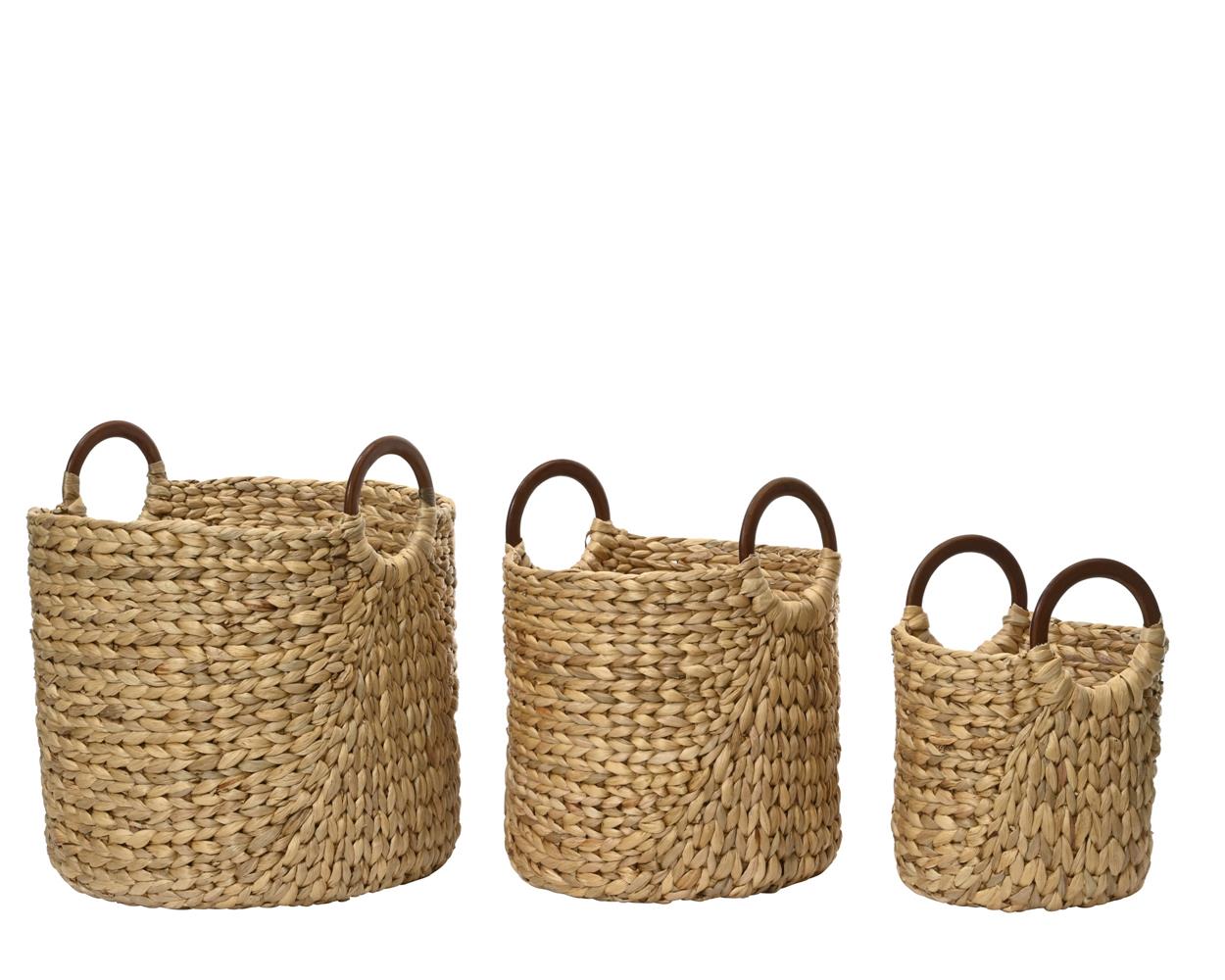 Bring warmth and natural beauty into your home with this set of three handmade baskets. The round baskets are crafted from tightly woven water hyacinth and feature a soft brown hue that adds extra character to your interior. The sturdy wooden handles provide an authentic touch and make them easy to move. This timeless design is a perfect fit for a cozy and naturally decorated living space.