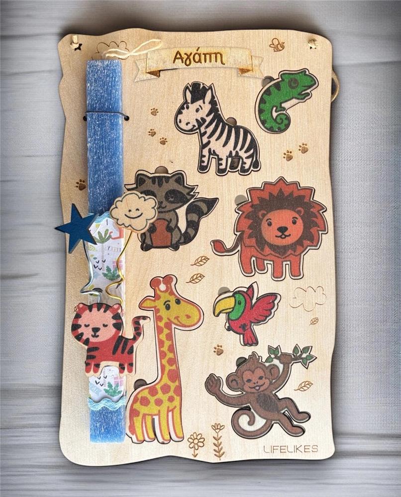 An educational and fun Easter gift that combines creativity with play! The handmade \"Montessori Puzzle Animals\" candle by Lifelikes is placed on an impressive wooden structure, which functions as a puzzle for young children, developing imagination and fine motor skills. The blue scented candle is accompanied by a wooden animal-magnet, which can be used after Easter either for play or as a decoration on the refrigerator or other surfaces. The wooden puzzle includes cute animals and features beautiful engravings with leaves and paws, creating a wonderful Montessori toy.
