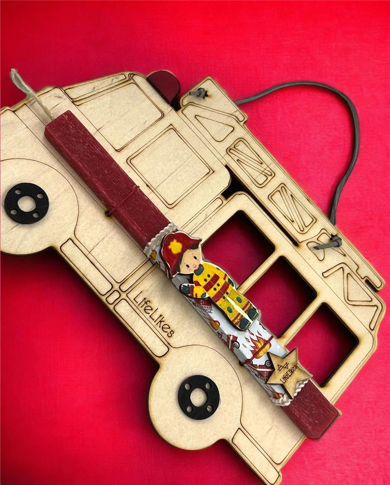 If your favorite christening party guests dream of becoming firefighter heroes, then this candle is perfect for them! The wooden frame in the shape of a fire truck is removable, giving children the opportunity to color it and express their creativity, and then hang it on the wall! The wooden firefighter on the candle is a magnet.