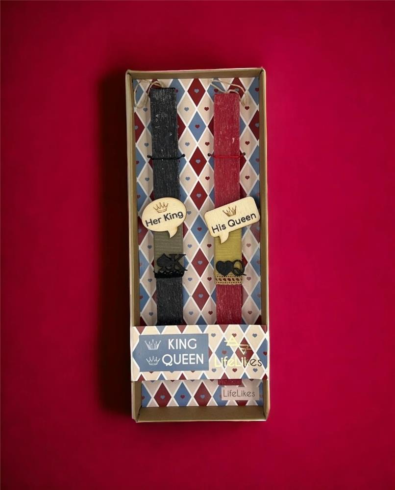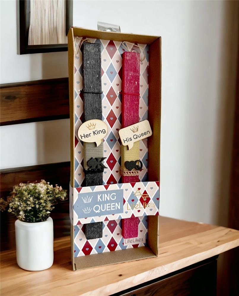 For those who love their other half and want to share even their candle this Easter, this double proposal is excellent! The candles are decorated with wooden elements, each with the characteristic phrase \"Her King\" and \"His Queen\" and wooden symbols, inspired by the symbols of playing cards. The candles are located in a box with a corresponding design.