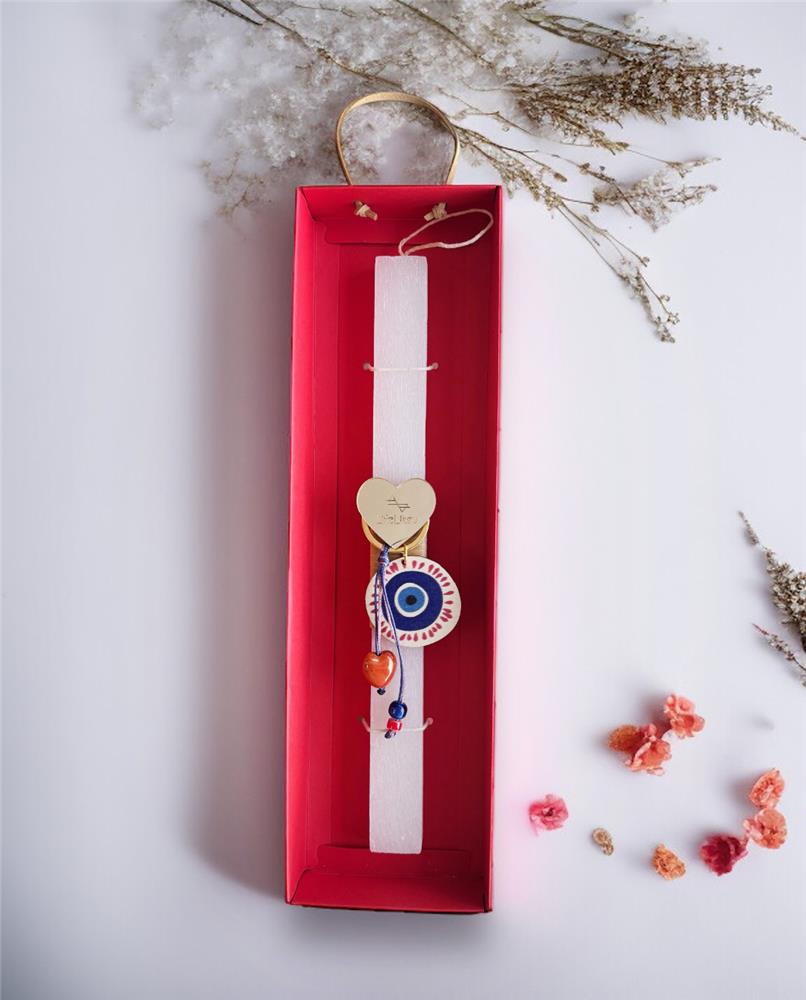 Discover a unique handmade candle with scented wax, decorated with an elegant heart magnet and a beautiful wooden amulet for good luck and protection. The amulet is a key ring that can decorate your keys or bag. It is placed in an impressive red packaging, ideal for a gift to loved ones. A unique symbol of luck and love, ideal for Easter!
