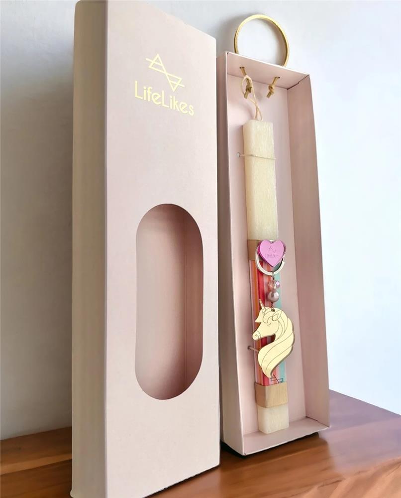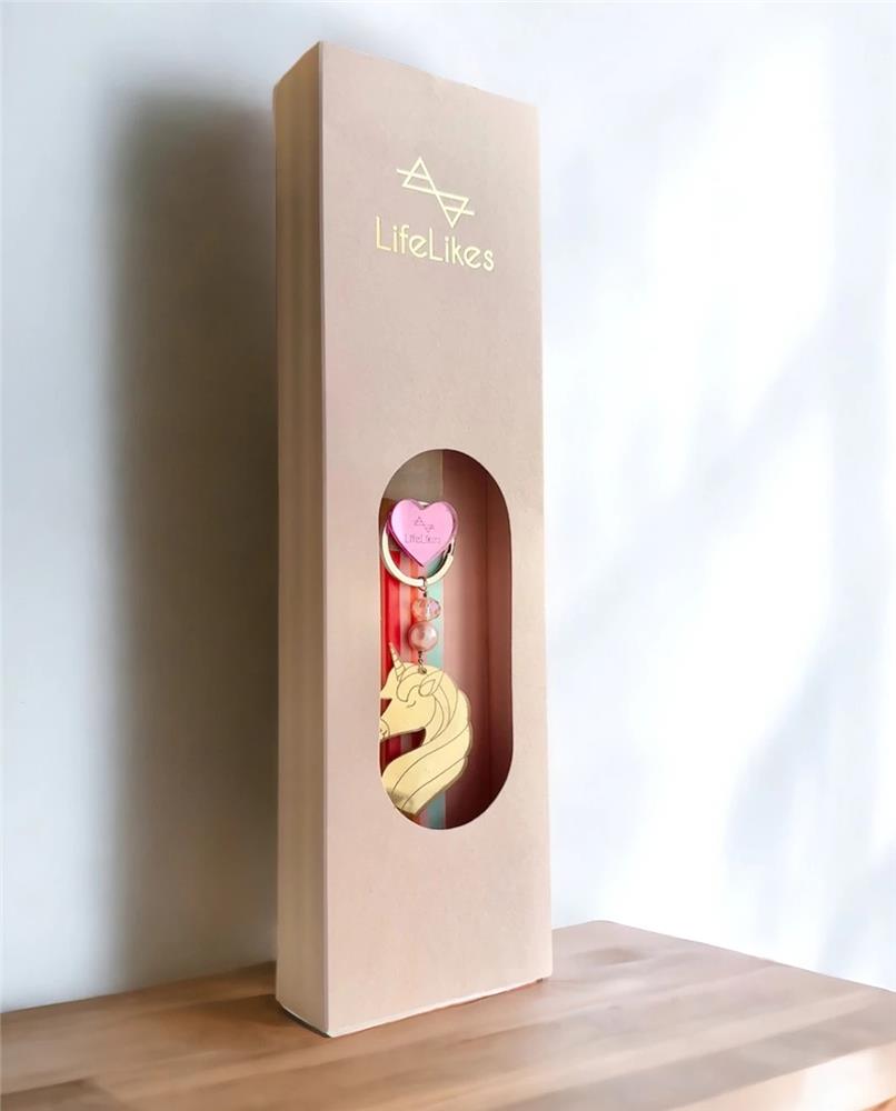 This scented candle comes with a unicorn-shaped key chain made of gold plexiglass. The candle is housed in a pink drawer box with gold foiling.