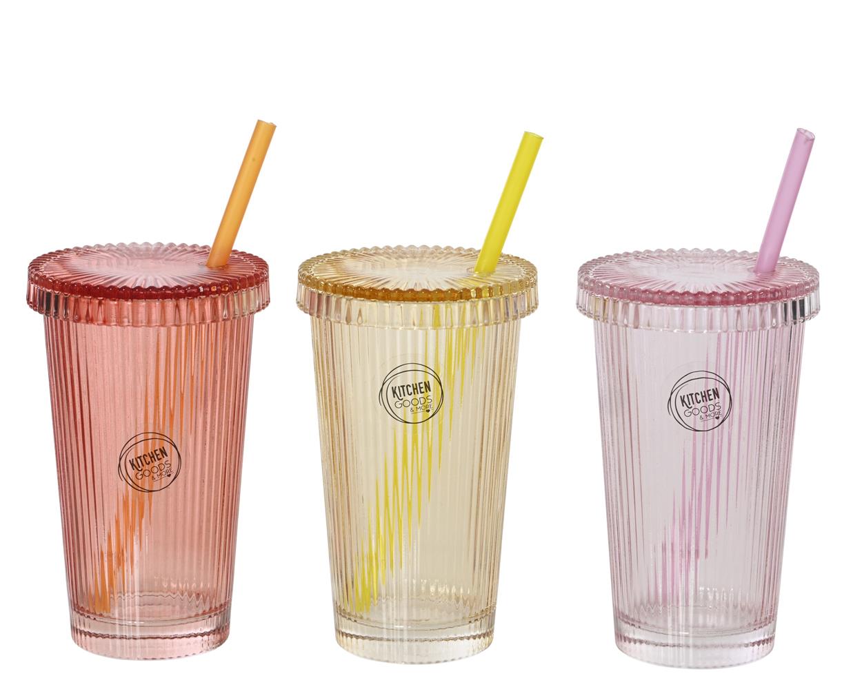 STRIPED GLASS WITH LID AND STRAW IN 3 COLORS KAEMINGK Glass Φ0.09*Η0.144