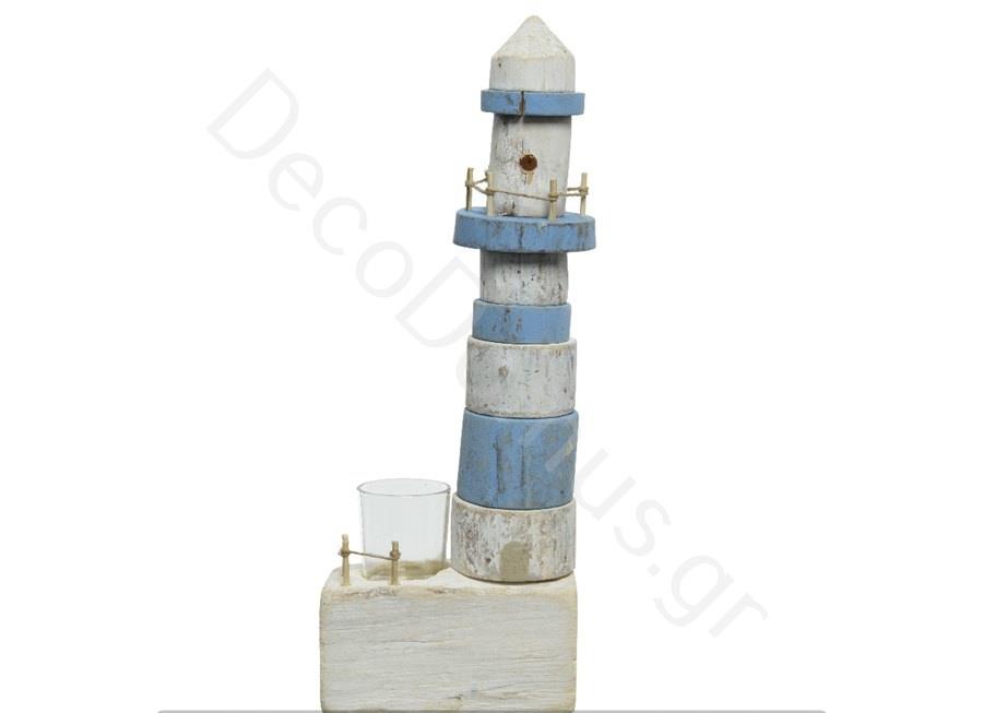 TEALIGHT HOLDER WHITE-LIGHT BLUE LIIGHTHOUSE Wood 14x9xh38
