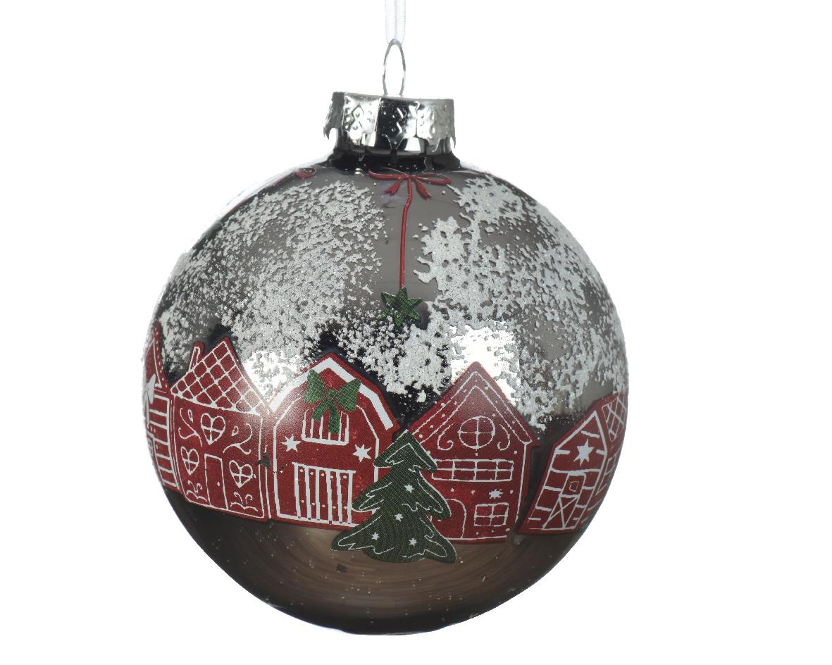 CHRISTMAS BAUBLE SILVER GLASS WITH RED HOUSES DECORIS- KAEMING Glass 8*8