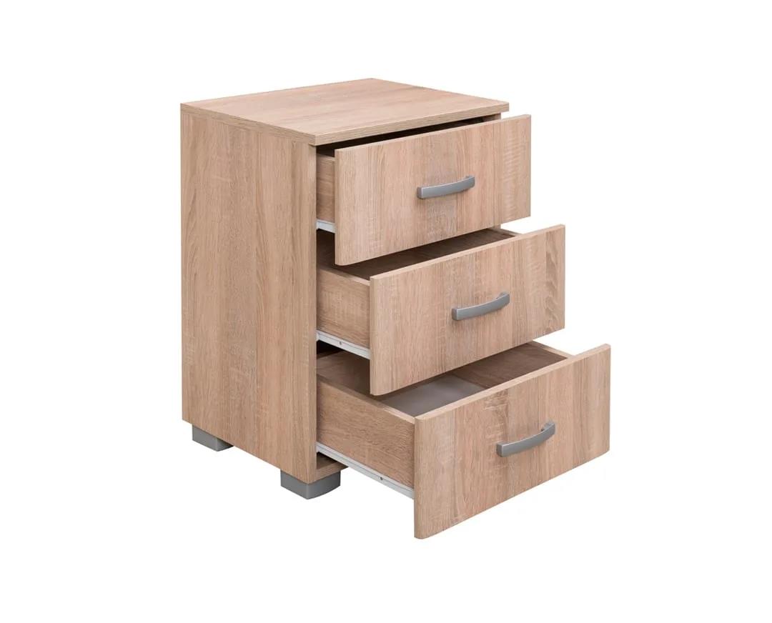 Ormaric 3F bedside table with 3 drawers and in 4 colors. It is made of high-quality and dense chipboard (melamine), 18 mm thick, from the European producers EGGER, KRONOSPAN. With certified and guaranteed mechanisms of the European houses INCOLL, HETTICH, TITUS. Metal handles - knobs from the European house RUJZDESIGN. ABS socorro finish, soft forming. High aesthetics, excellent quality, economical, functional.