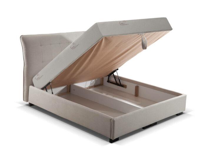 Modern bed, of high quality and aesthetics with storage space and mattress. The mattress integrated in the slatted frame is raised with a shock absorber with a simple movement to access the storage space, in which 2 air ducts are installed for continuous air circulation. The storage area consists of 2 boxes of 70*200cm for easier and safe transport. Solid beech wood legs. The height of the headboard is 125cm. Choose the color and texture of the fabric that suits you in your room and rest every day. The price includes the cost of fabric.
