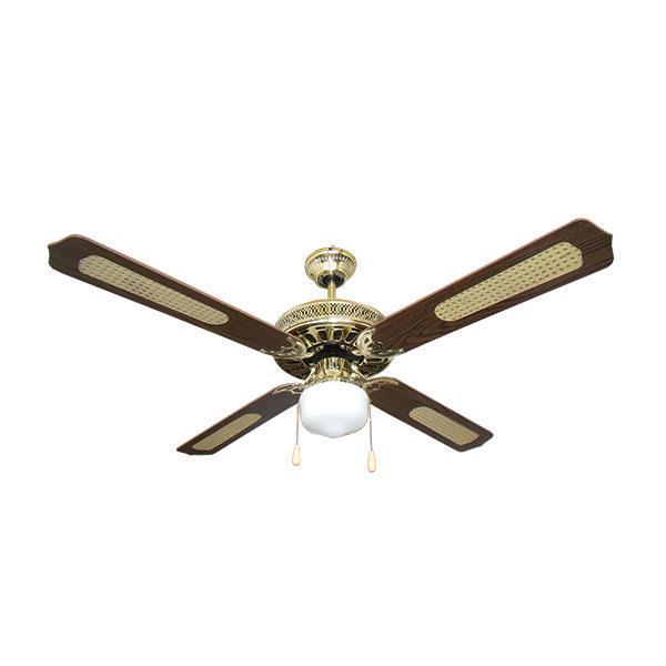Single light ceiling fan in brown-gold color. Capable of covering 15m² of space, reverse rotation. Suitable for winter and summer. It has a socket for 1 lamp with an E27 socket, 4 propellers with a diameter of Φ132, a traction switch and 3 stairs with a maximum speed of 200rpm and an output of 70W. Net weight 4.7kg, operating sound up to 40dB. Warranty 2 years by Eurolamp.