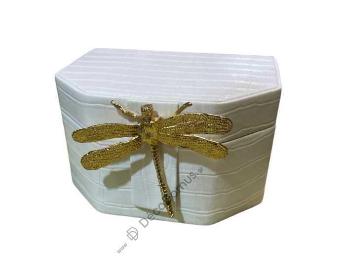 HANDMADE DECORATIVE WHITE LEATHER BOX WITH GOLD DRAGONFLY Metal 16x14xh9