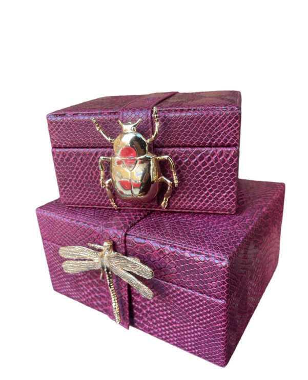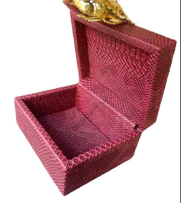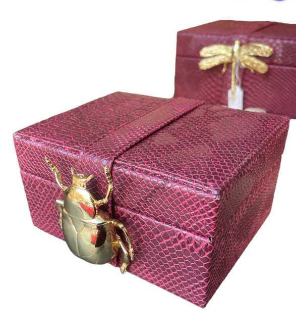 HANDMADE DECORATIVE BURGUNDY LEATHER BOX WITH GOLD BEETLE Metal 16.5x15xh9