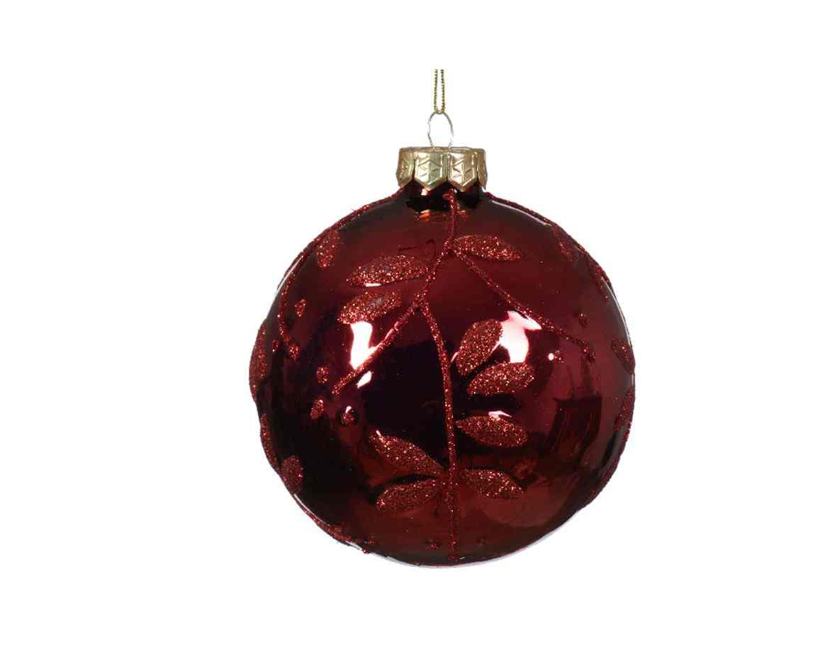 CHRISTMAS ORNAMENT - RED GLOSSY GLASS BALL WITH EMBOSSED LEAVES Glass DIM 10 CM