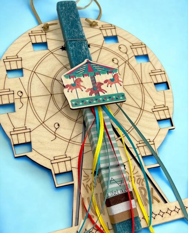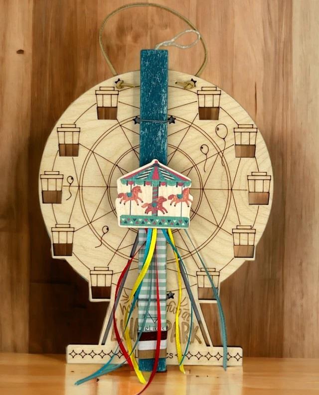 If your favorite christenings love the amusement park, then this candle is perfect for them! The amusement park-shaped wooden frame is removable, giving kids the chance to color and express their creativity and then hang it on the wall! The wooden element on the candle is a magnet and is easily removed.