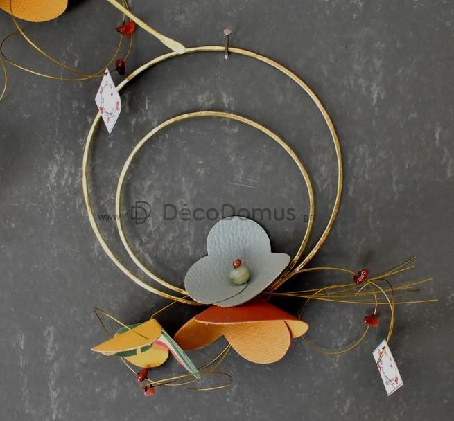 Metal wreath with a pansy flower made of fabric and leather, diameter 12cm.