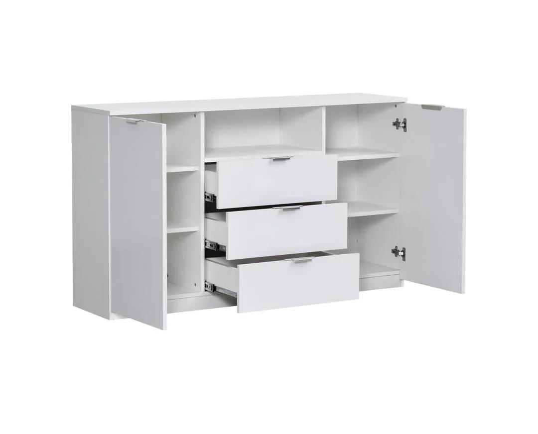 Ideal dresser, sideboard for all areas of the house for storage, arranging things.Also ideal for a TV stand. It has 2 cabinets with 3-level shelves on the two doors on the right and left of the furniture, while in the middle 3 external deep drawers with telescopic mechanisms. It also has an open shelf in the middle of the furniture for DVD, CD, home cinema, playstation... The handles are made of aluminum for higher aesthetics and greater durability. Modern coloring in the color of Ammos in High gloss glossy and Nordic Oak. Using new top quality materials, FUNDERMAX chipboard, Hettich mechanisms, Furnika technology, we offer you a complete range of Grande products of absolute quality, modern aesthetics, fresh colors, affordable price, excellent value for money.