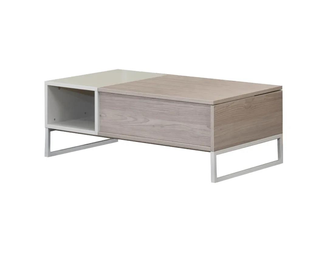 Coffee table with a lift-up food server and storage space under the server in a modern retro design. Metal legs painted in the color of the table. High quality construction, modern, simple design, practical to use. Available in 3 modern color combinations, white with gray oak, artisan with charcoal and elegance combination of Nordic oak with sand.
