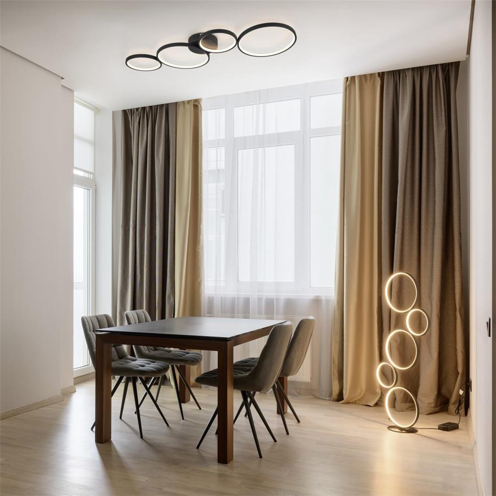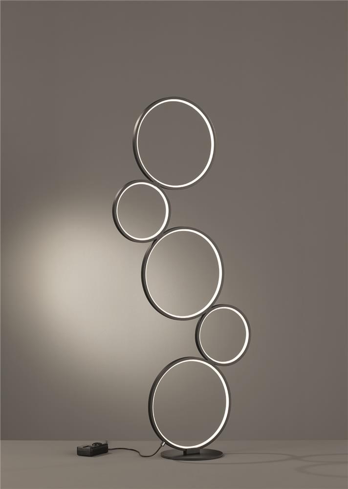 With its five stacked rings of different diameters, the RONDO floor lamp is a real eye-catcher. The floor lamp has an integrated dimmer that is controlled via the cord switch. This allows you to flexibly control the brightness of the LEDs installed on the inside of each circle. The 115 cm high floor lamp is a real decorative element and stylishly enhances any living space. Thanks to the matt black colour scheme, the light can be combined with many furnishing styles. In addition, the luminaire features modern LED technology, which is characterised by high light quality and energy efficiency. Compared to conventional halogen lamps, up to 80% of energy costs can be saved. In addition, LED light sources have a long service life, produce less heat and protect the environment.