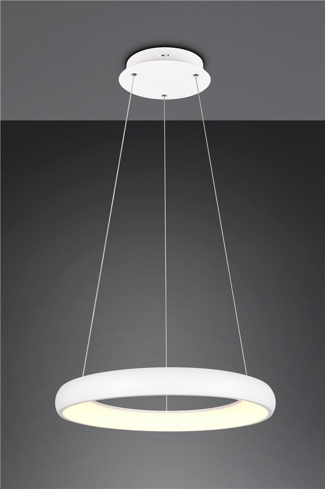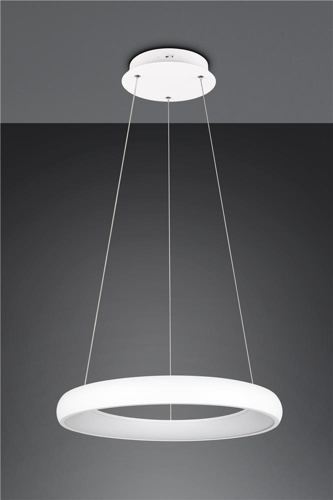 Clarity and functionality combined - the CARDONA pendant light impresses with its striking design, which is characterised by a floating ring. This elegant ring seems to literally float in the room and attracts everyone\'s attention. Ideal for modern living rooms, offices or dining rooms, the luminaire provides uniform, glare-free lighting thanks to the subtle light source inside the ring, creating a pleasant atmosphere. The brightness can be regulated in three levels using a conventional light switch and the light colour can be adjusted directly using a switch on the luminaire. The white matt surface gives every room a timeless elegance and a modern touch. The luminaire also features modern LED technology, which is characterised by high light quality and energy efficiency. Compared to conventional halogen light sources, up to 80% of energy costs can be saved. LED light sources also have a long service life, produce less heat and protect the environment.