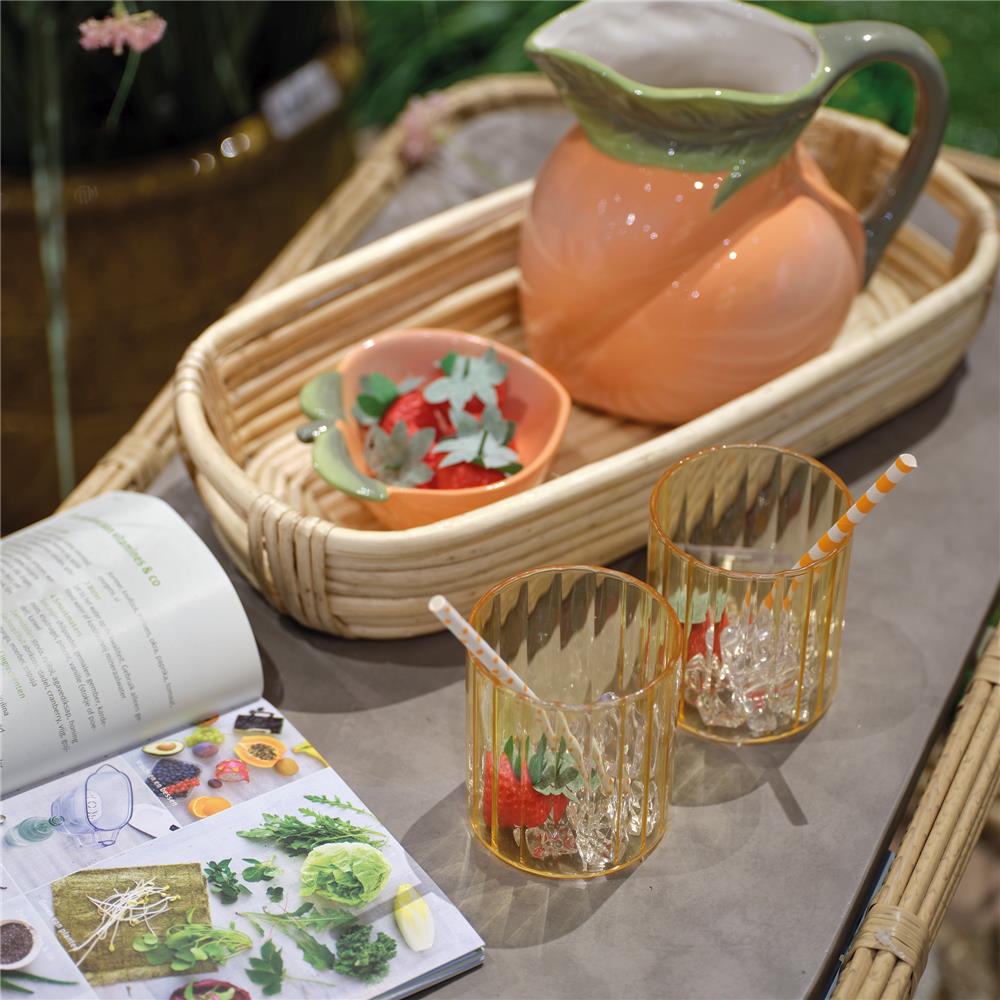 Each glass is made of clear glass with a transparent, sprayed finish and subtle vertical lines that create a playful texture and elegance. The soft, diverse colors enhance the fresh and modern look, making them a perfect fit for a contemporary interior. With a height of 9 cm and a diameter of 8 cm, these glasses offer a comfortable grip and versatility for any occasion.