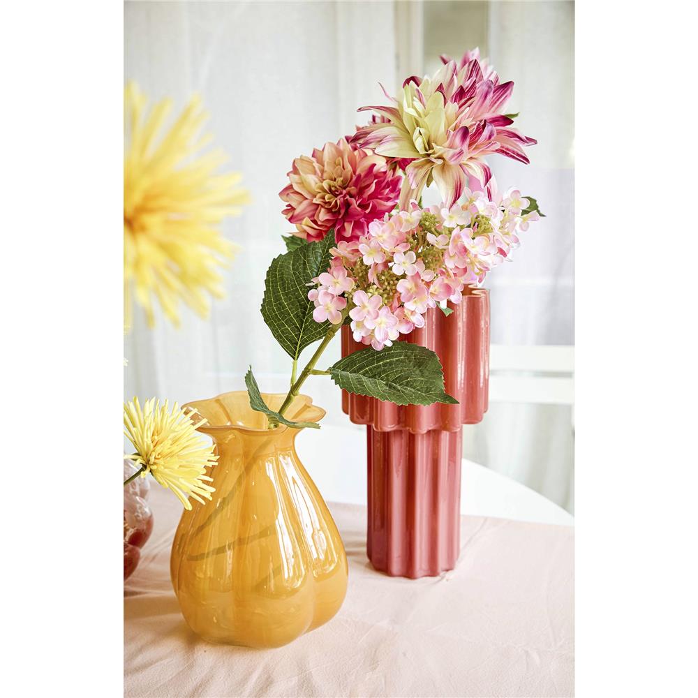 Bring warmth and expression into your interior with this unique vase from Decoris. The handmade design is crafted from glass and features a striking red color with a soft milky finish that subtly diffuses light. With its organic, wavy shape, it adds a playful and artistic touch to any space. This vase fits perfectly in modern and eclectic interiors and invites you to display flowers or decorative branches.