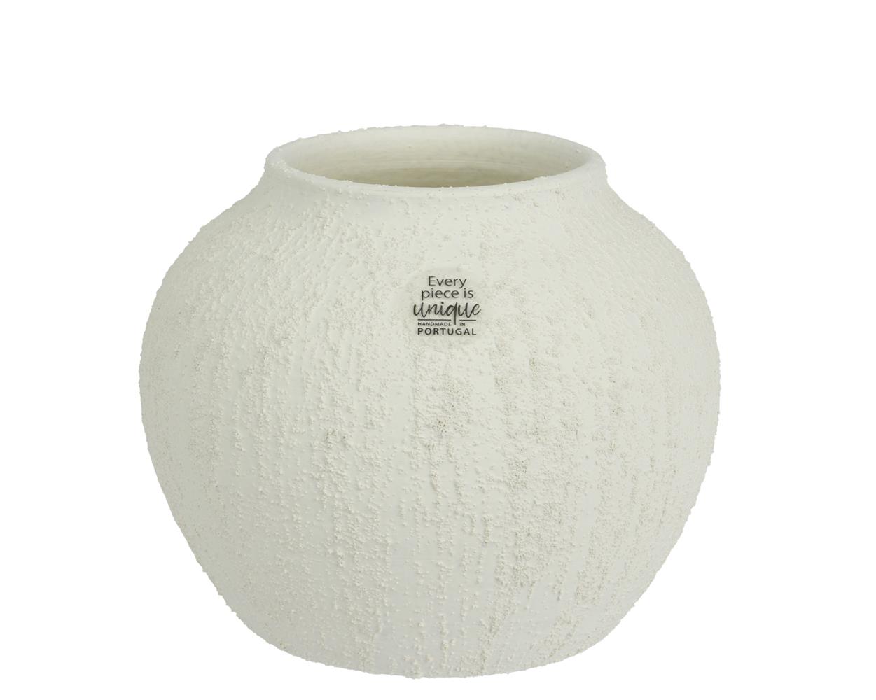 Bring a serene and pure look into your home with this handmade vase from Decoris. The spherical vase is made of terracotta with a sandy texture, creating a natural and tranquil atmosphere. The soft white color scheme fits perfectly in a light and airy interior, with each piece being unique thanks to the artisanal production process. This vase adds a subtle, timeless elegance to any space.