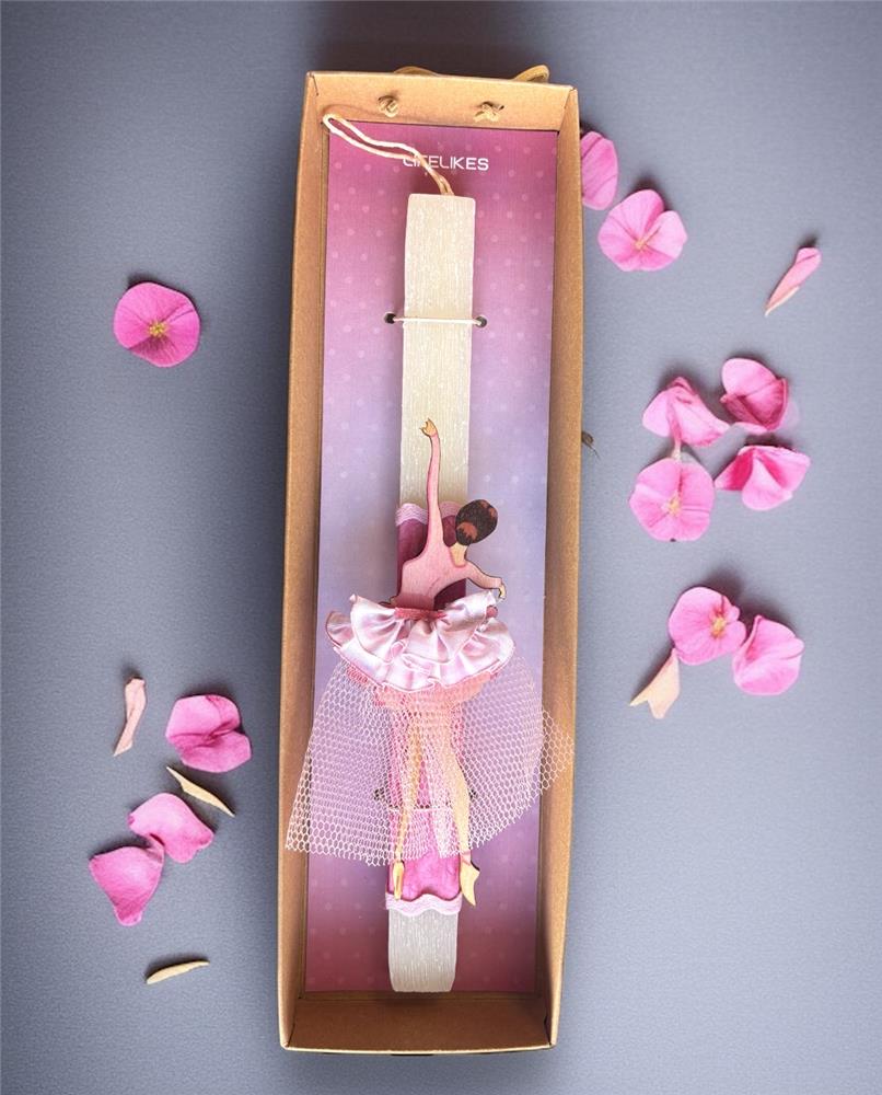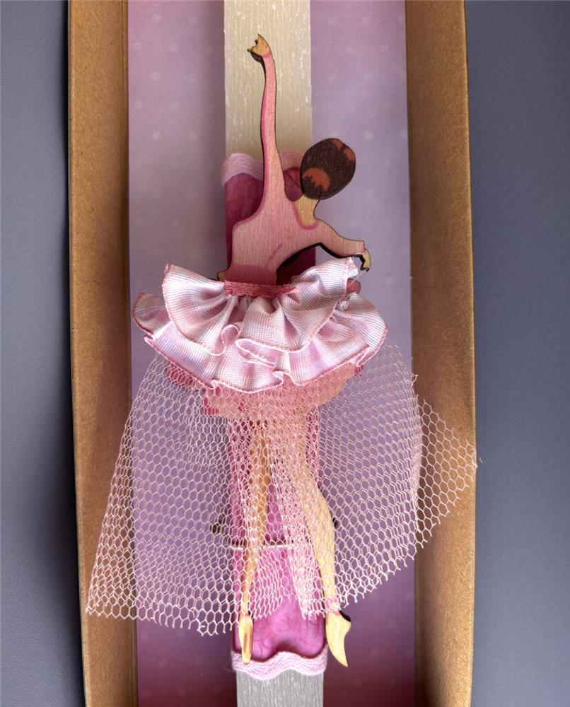 Give an elegant and romantic Easter gift with the handmade, scented candle \"Ballerina\" from Lifelikes! This unique candle is decorated with a wonderful wooden ballerina figure, which features a puffy tulle skirt, adding a special sense of elegance and grace. The white scented candle blends harmoniously with the ballerina figure, which is a magnet, allowing the child to use it in their decoration after Easter! The romantic packaging in soft pink-lilac tones complements its fairy-tale style, making it the perfect choice for little ballet lovers!