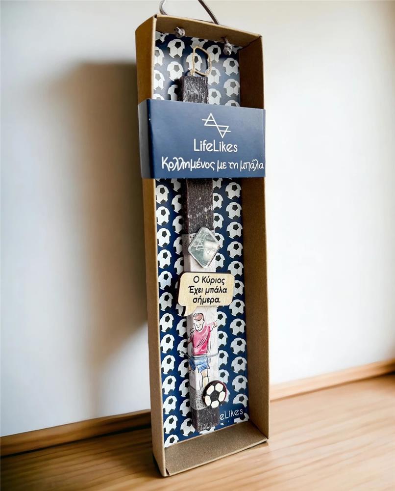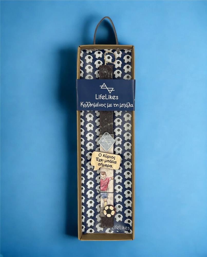 Does he not forget football or Easter? Then this handmade candle is perfect for him! The blue candle is decorated with easily removable wooden and plexiglass elements, which are magnets. The candle is located in a drawer box with a matching design.