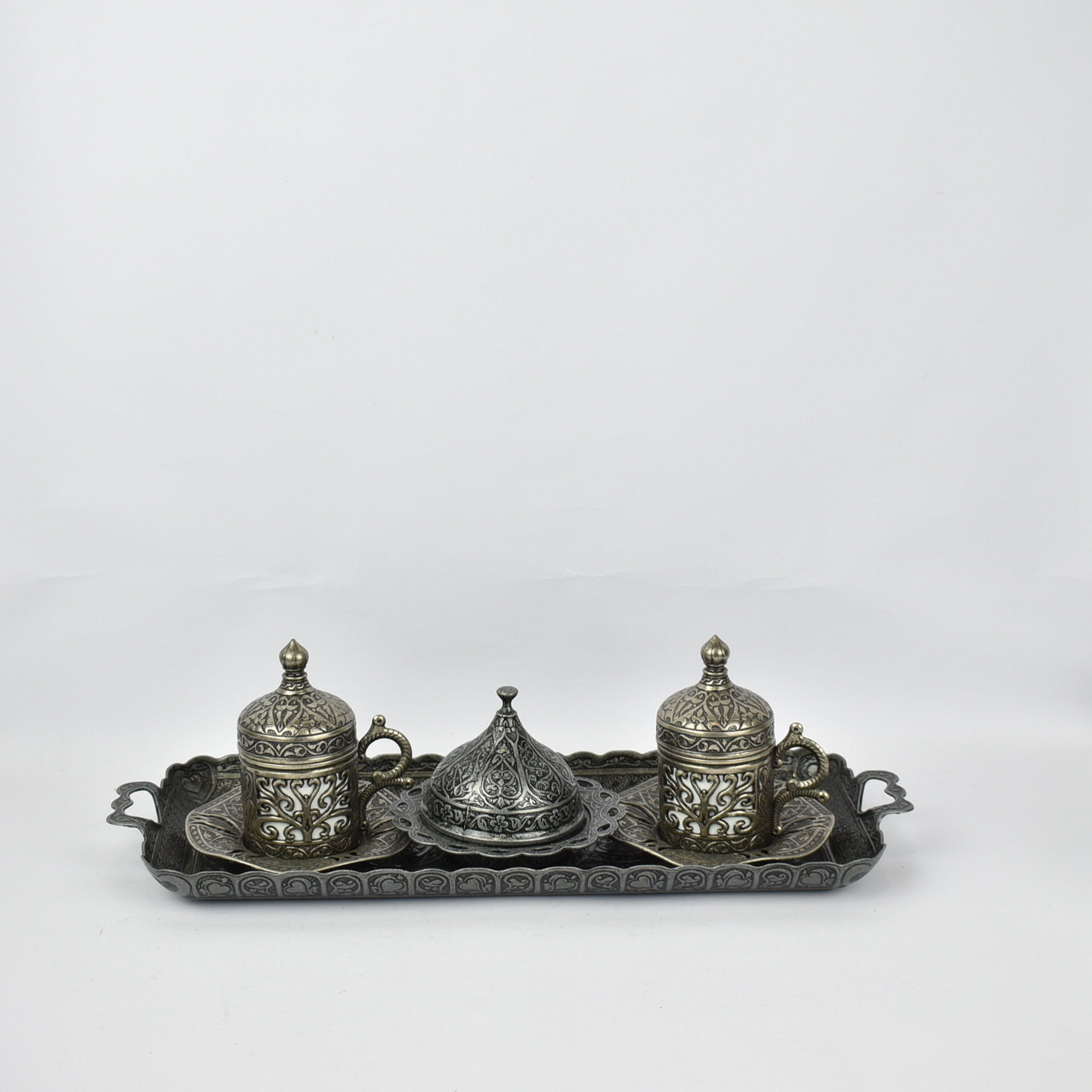 SILVER TRAY WITH 2 CUP OF COFFEE AND DESSERT PLATE Porcelain 36*14*10