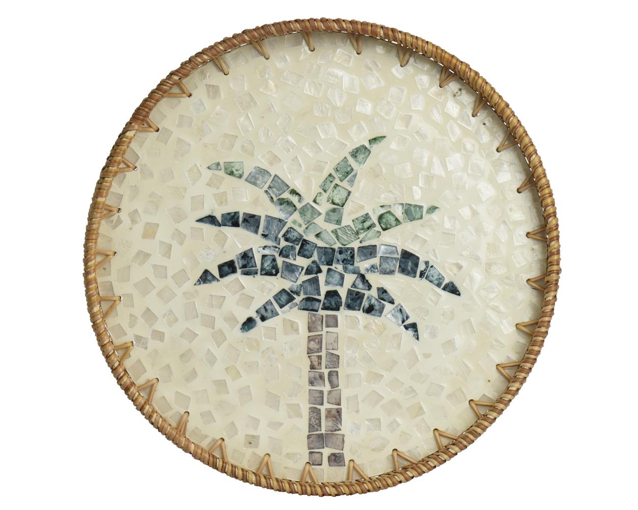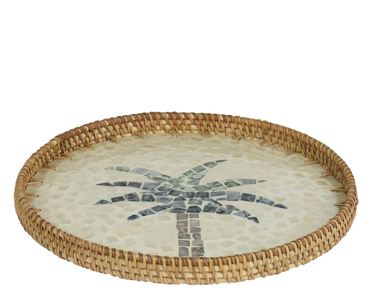 \"Στρογγυλός Λευκός Δίσκος με Διακόσμηση Φοινίκων, Χειροποίητο Ρατάν, O 34 εκ.