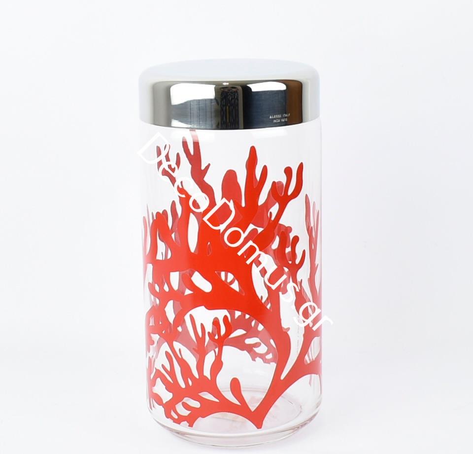 Blank pageΒάζο αποθήκευσης γυάλινο διάφανο με σχέδιο από κοράλι και inox 18/10 καπάκι.