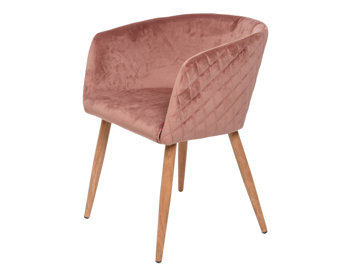 Blank pageΠολυθρόνα βελούδινη ροζ με πόδια αλουμινίου σε χρώμα όψη ξύλου σε φυσικό χρώμα, αναπαυτικό κάθισμα.